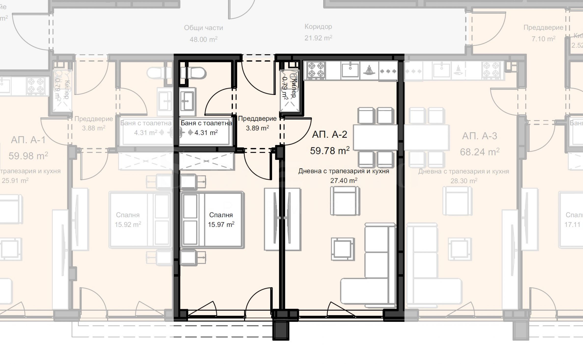 Mieszkania są oddawane w stanie wykończenia zgodnym z bułgarskimi normami budowlanymi, z tynkiem i wylewką: