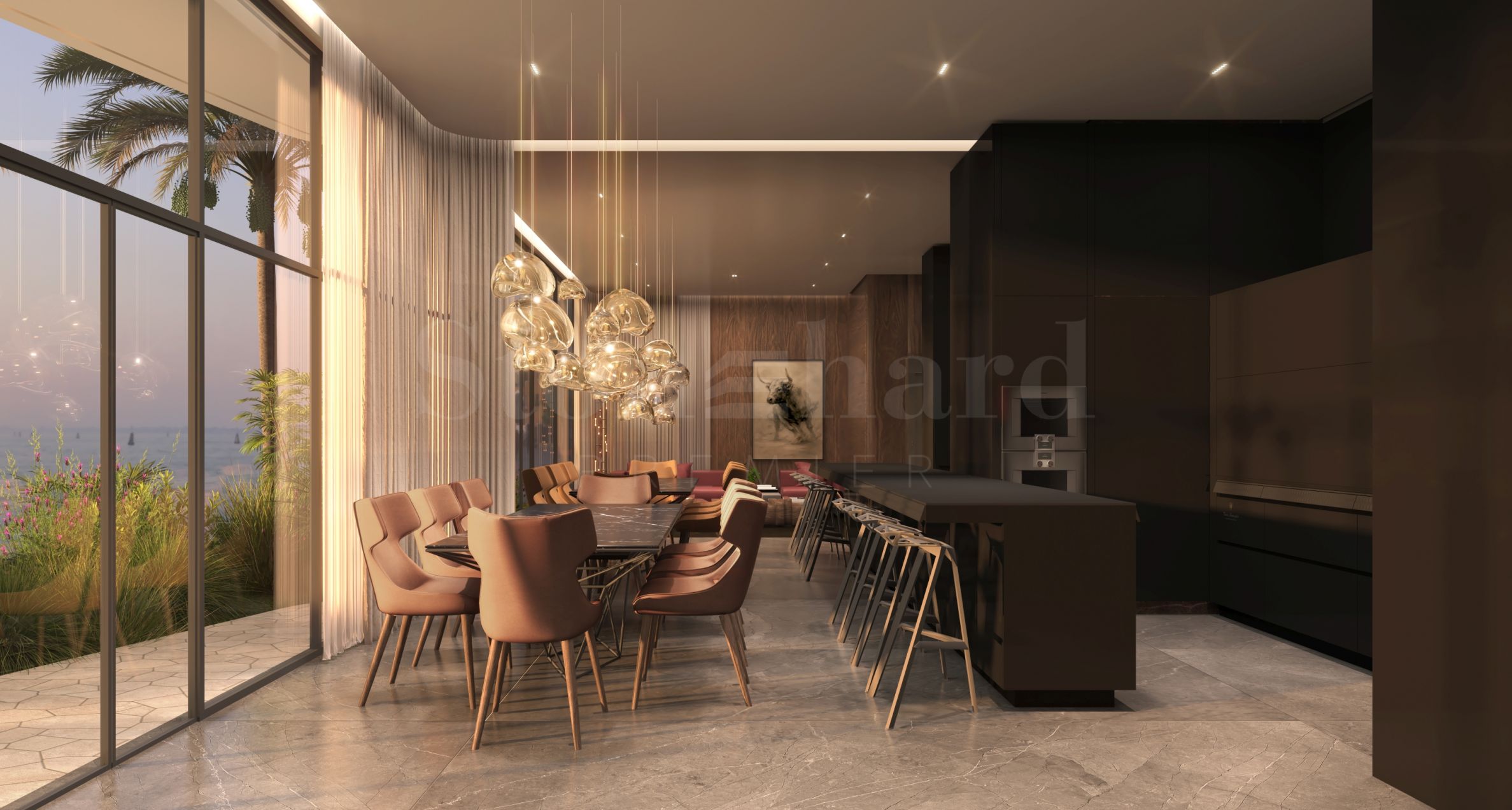 Komfort akustyczny, delikatne oświetlenie i przemyślane przejścia między materiałami tworzą atmosferę cichego skupienia. Wnętrza zostały pomyślane jako naturalne przedłużenie języka designu Tonino Lamborghini – śmiałe, wyrafinowane i dyskretnie eleganckie. Czyste linie architektoniczne kształtują przestronne bryły, które pozwalają światłu swobodnie przepływać po wytłaczanych powierzchniach i precyzyjnie dobranych wykończeniach. Stonowana paleta ciepłych, neutralnych tonów, uzupełniona subtelnymi metalicznymi akcentami, tworzy harmonię z nadmorskim otoczeniem, zachowując jednocześnie wyraźnie rozpoznawalny styl.