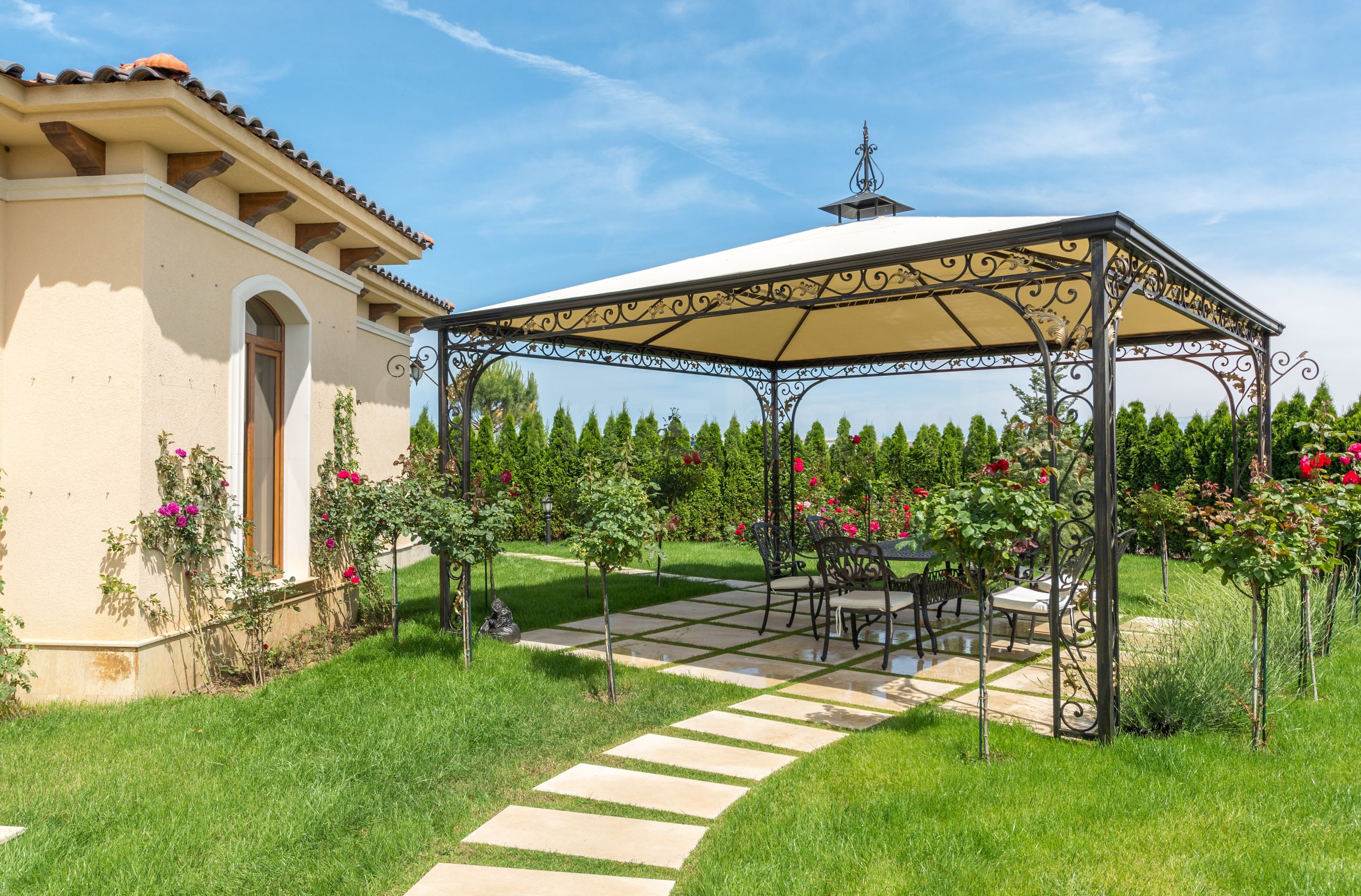 Ogród jest przestronny i bogato zagospodarowany egzotycznymi drzewami i kwiatami. Wokół basenu wydzielono strefy do wypoczynku i rozstawiania leżaków.