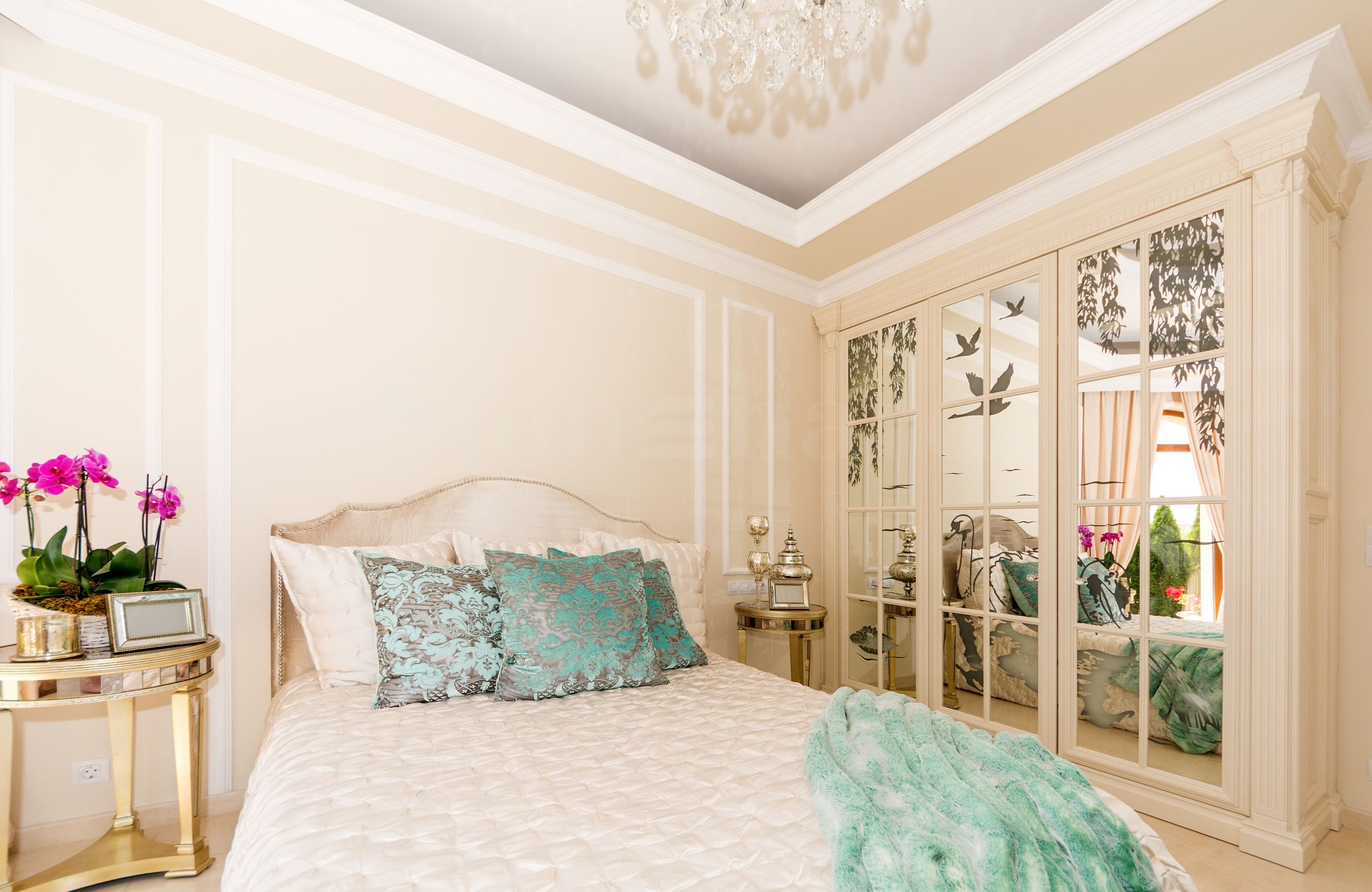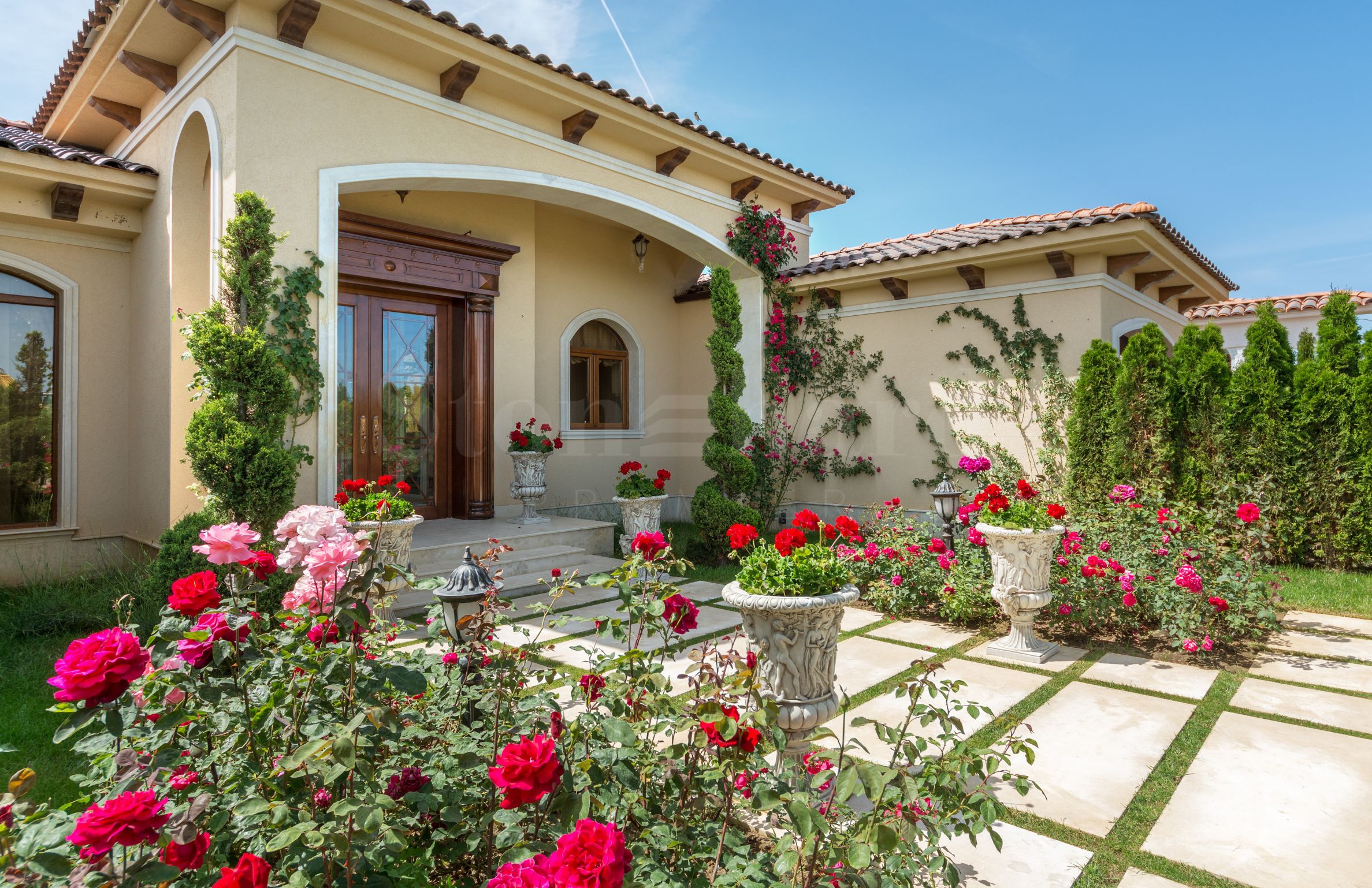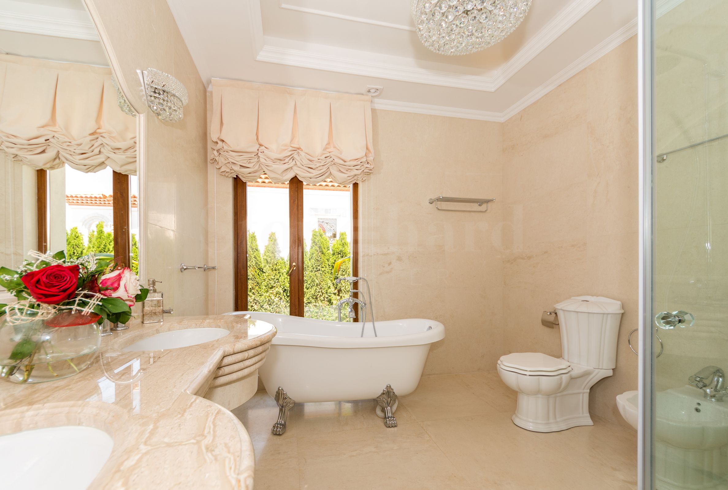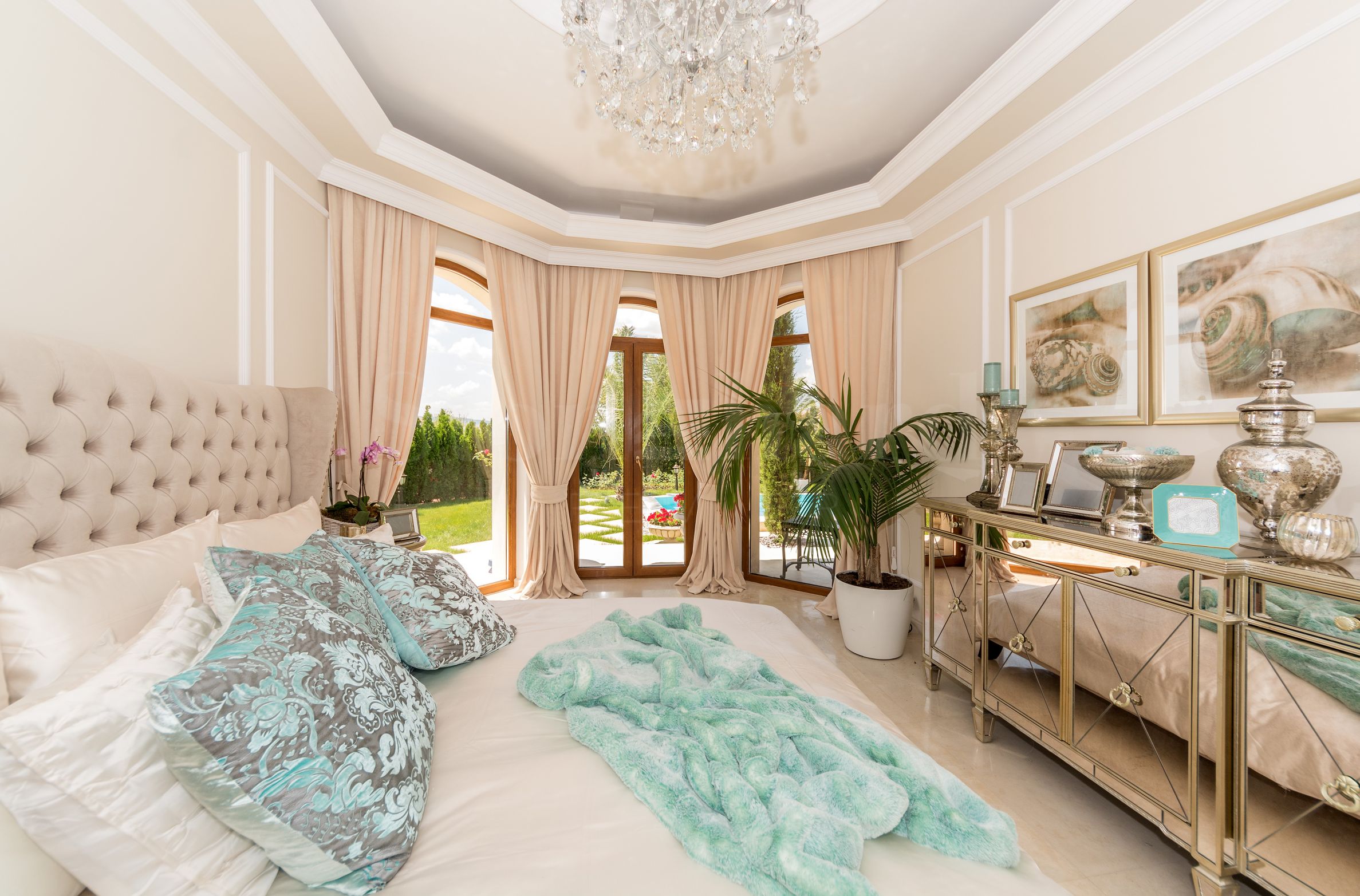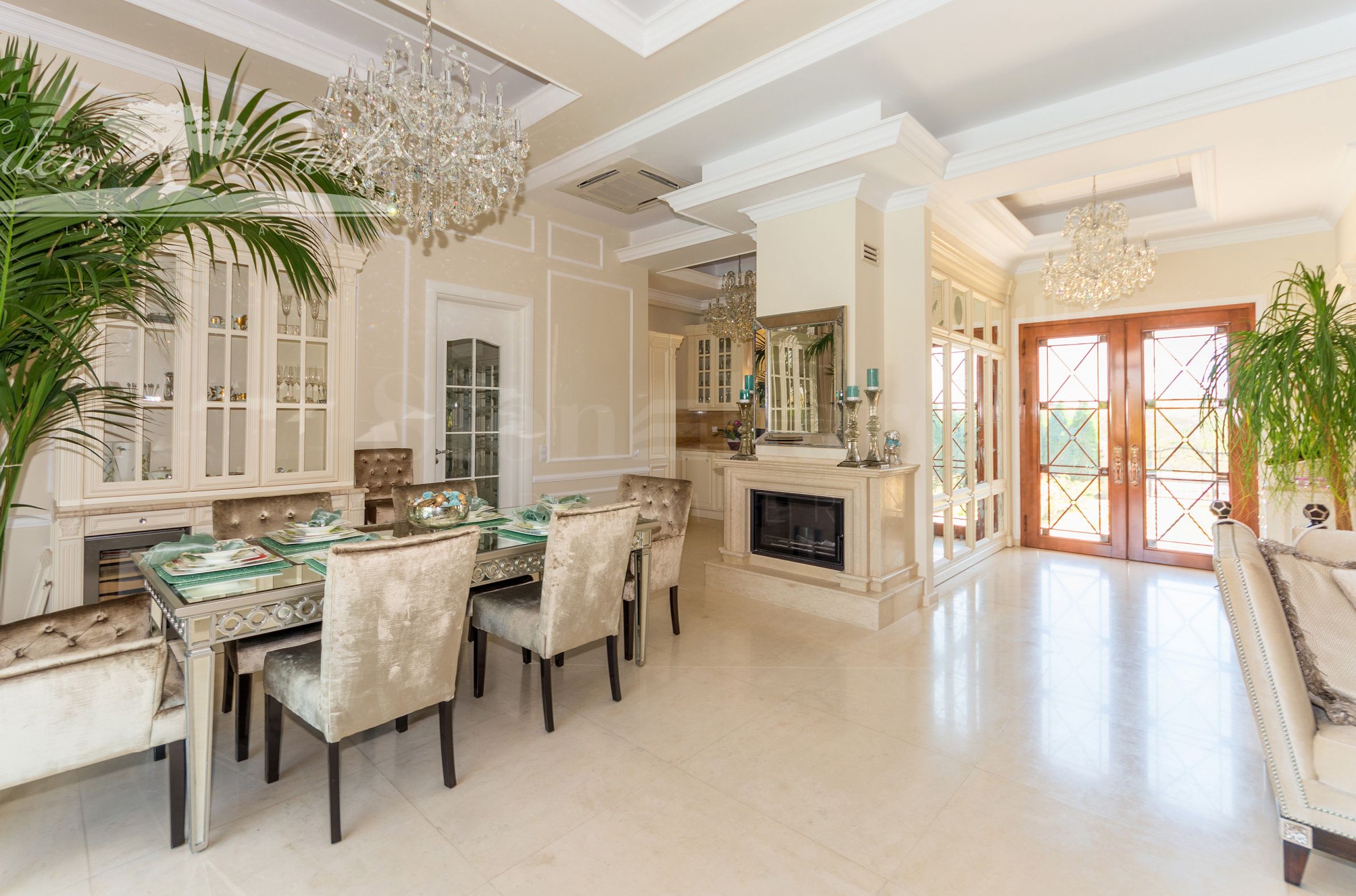 Wnętrze willi jest luksusowo wykończone i umeblowane indywidualnie zaprojektowanymi meblami, designerskimi witrażami oraz najwyższej jakości naturalnymi materiałami, które dodają wyrafinowanego stylu i elegancji.