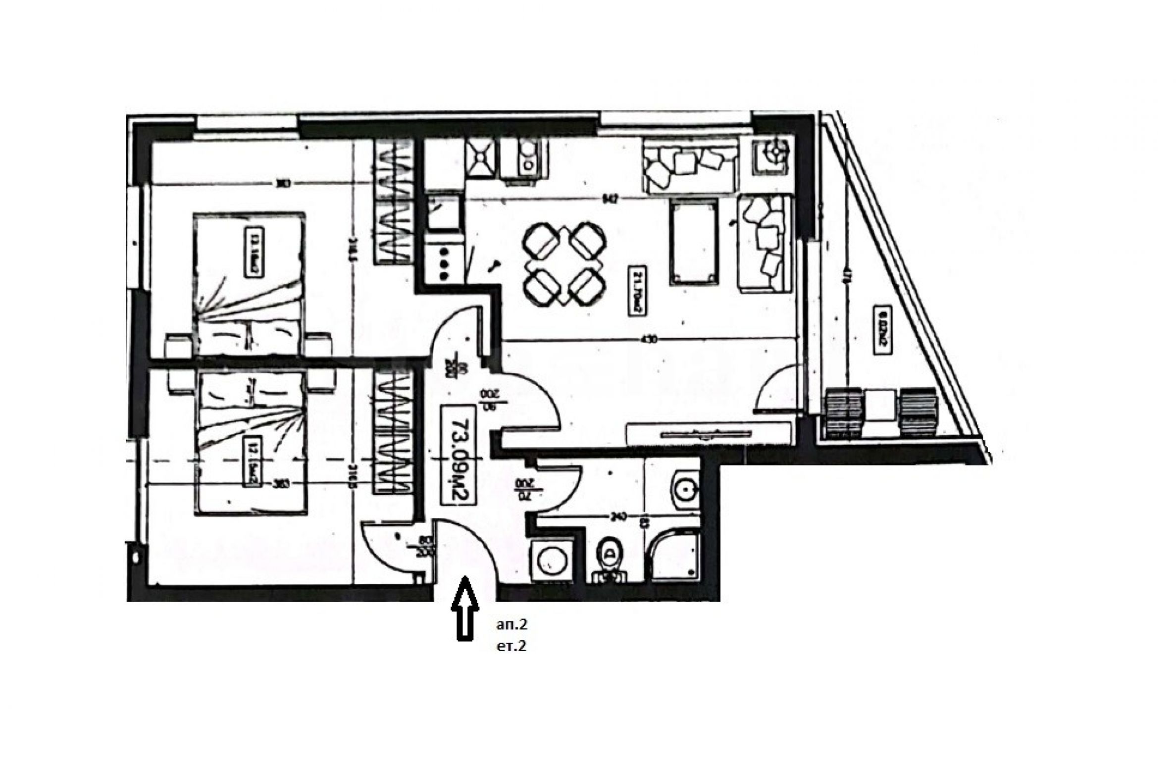 Składa się z przedpokoju, przestronnego salonu z aneksem kuchennym, dwóch sypialni, łazienki z toaletą oraz tarasu.