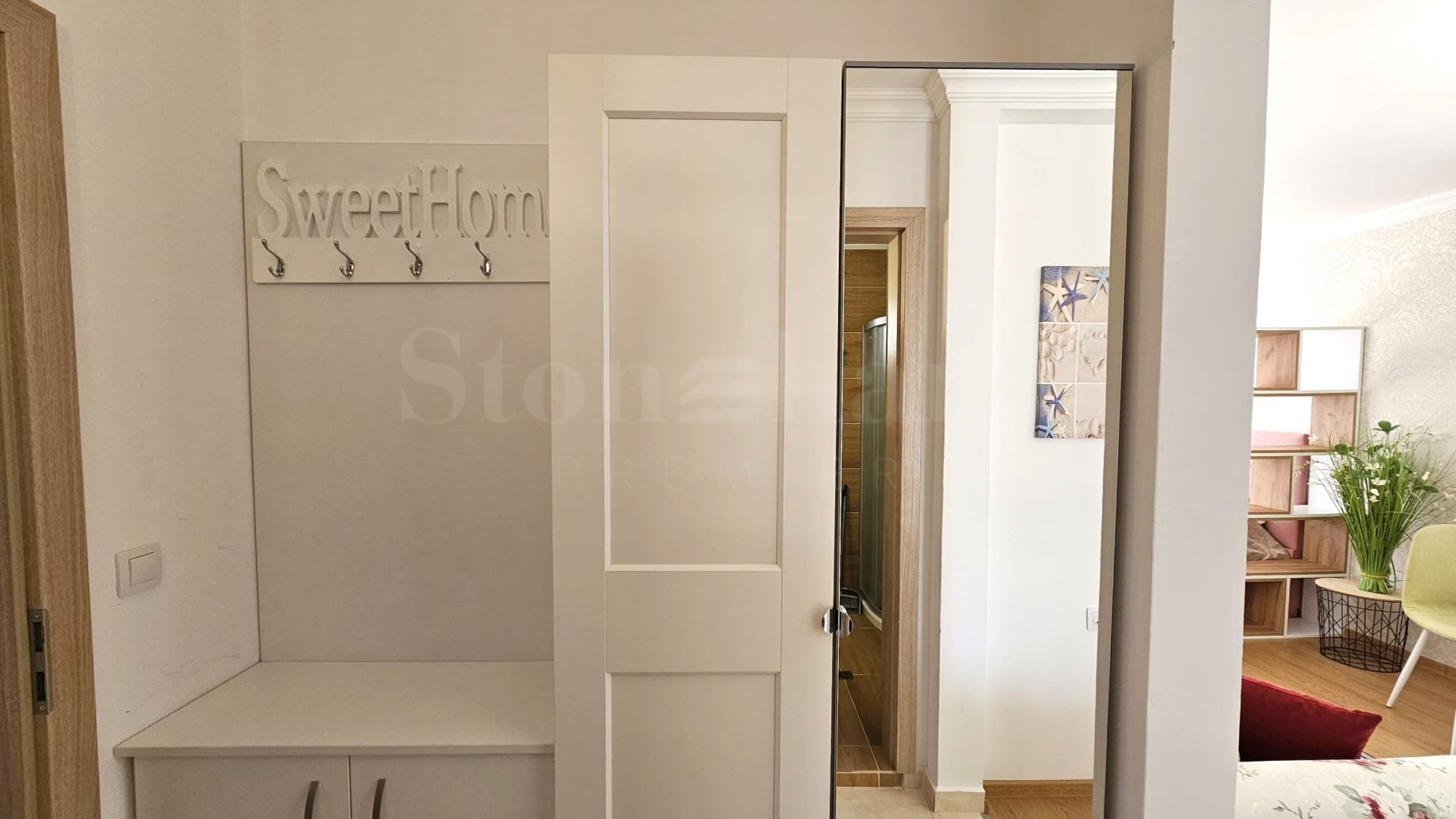 Mieszkanie zlokalizowane jest na czwartym piętrze i składa się z przedpokoju, przestronnego, jasnego salonu z aneksem kuchennym, jadalni oraz części sypialnej z łóżkiem małżeńskim, łazienki z kabiną prysznicową, tarasu z widokiem na basen. Nieruchomość jest umeblowana, wyposażona w sprzęt AGD i gotowa do zamieszkania.