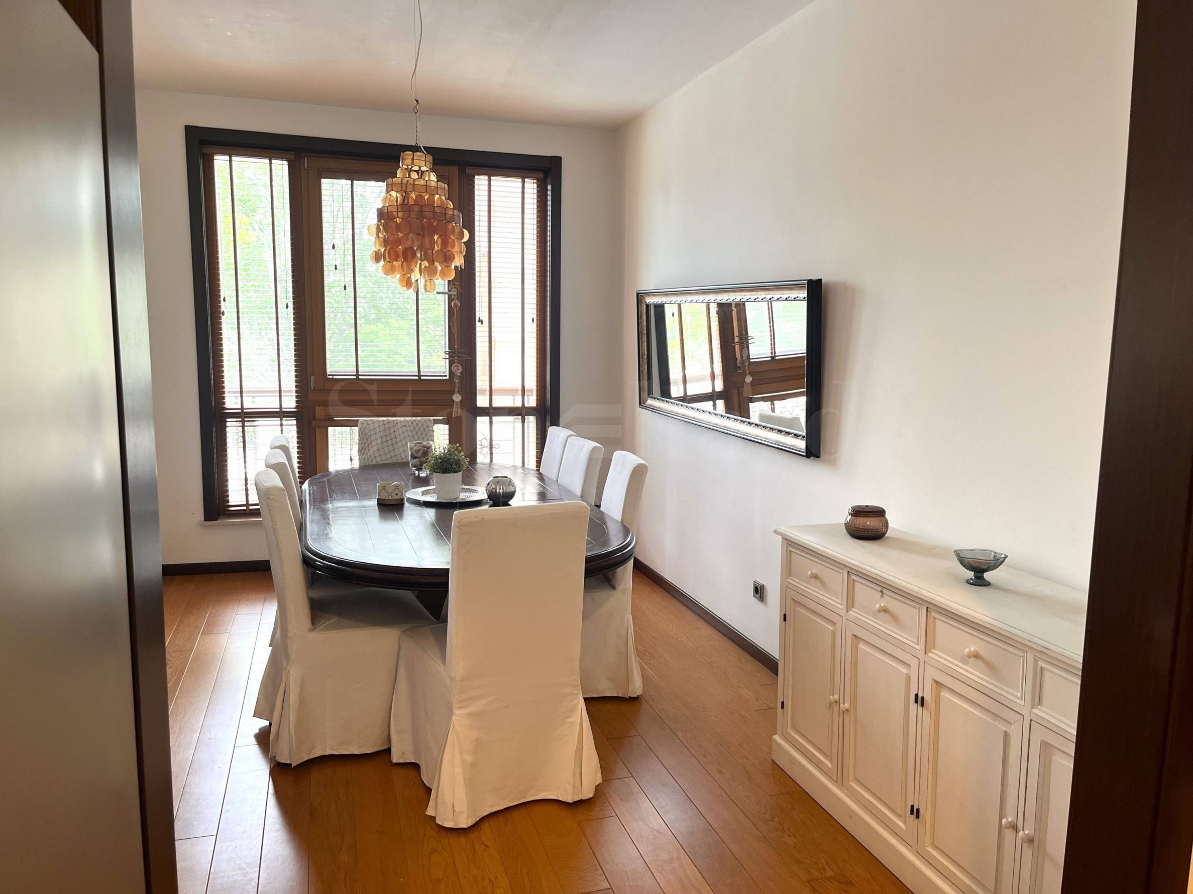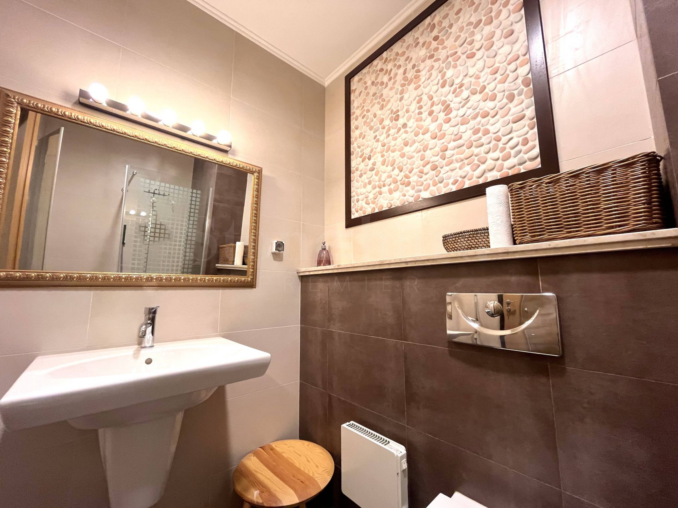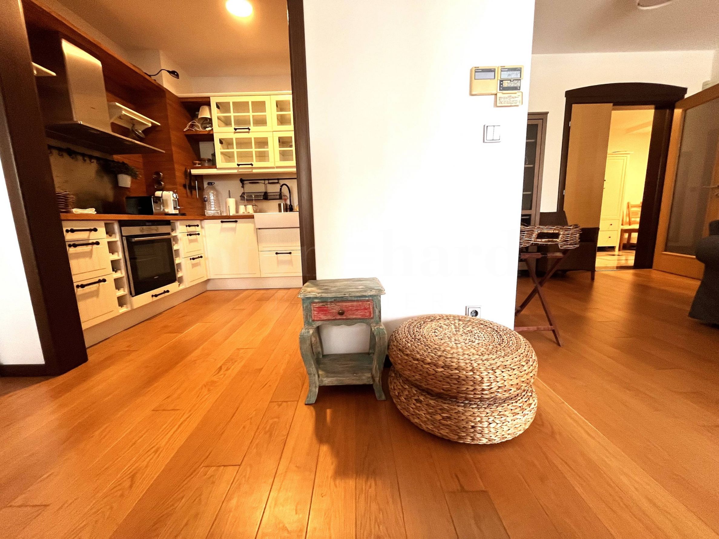 dwa tarasy. Mieszkanie jest w pełni umeblowane i wyposażone w nowoczesne i wygodne meble, wysokiej klasy sprzęt AGD oraz dbałość o każdy szczegół. Stolarka wykonana z drewna eukaliptusowego zapewnia doskonałą izolację akustyczną, a na podłodze znajduje się trójwarstwowy parkiet naturalny.