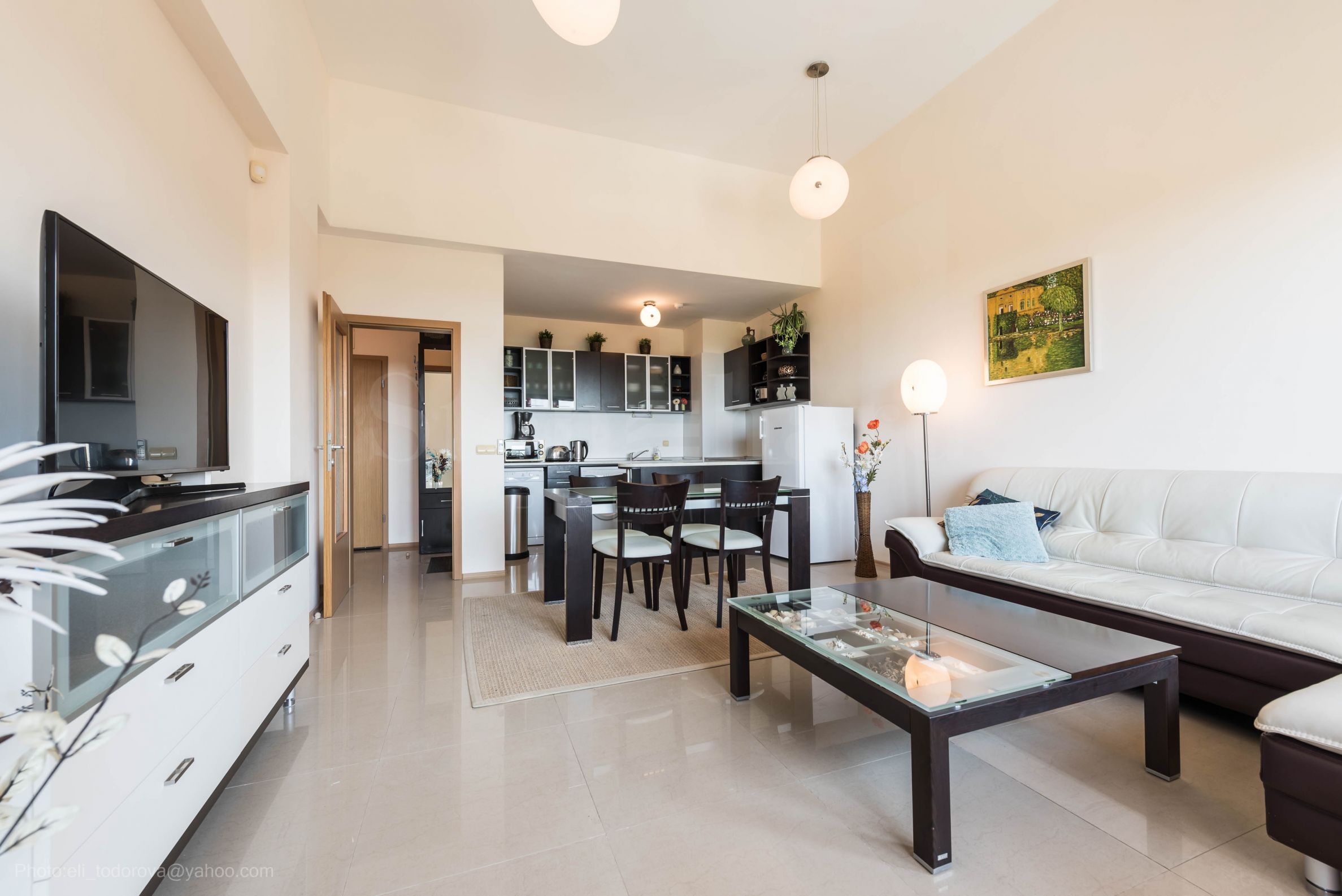 pokój dzienny z aneksem kuchennym i jadalnią;