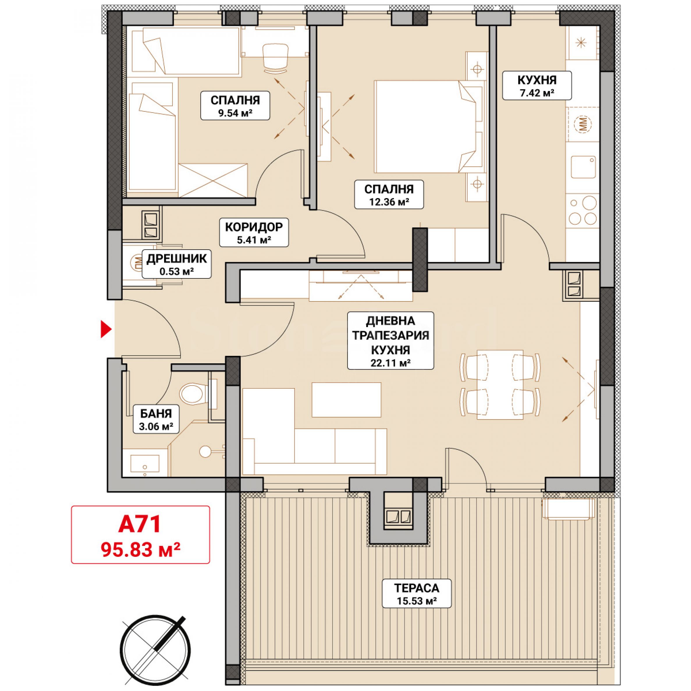 Mieszkanie jest trzypokojowe, o powierzchni całkowitej 115,13 mkw. (powierzchnia netto 95,83 mkw. + powierzchnie wspólne 19,31 mkw.) z tarasem o powierzchni 15,53 mkw. i znajduje się na szóstym piętrze.