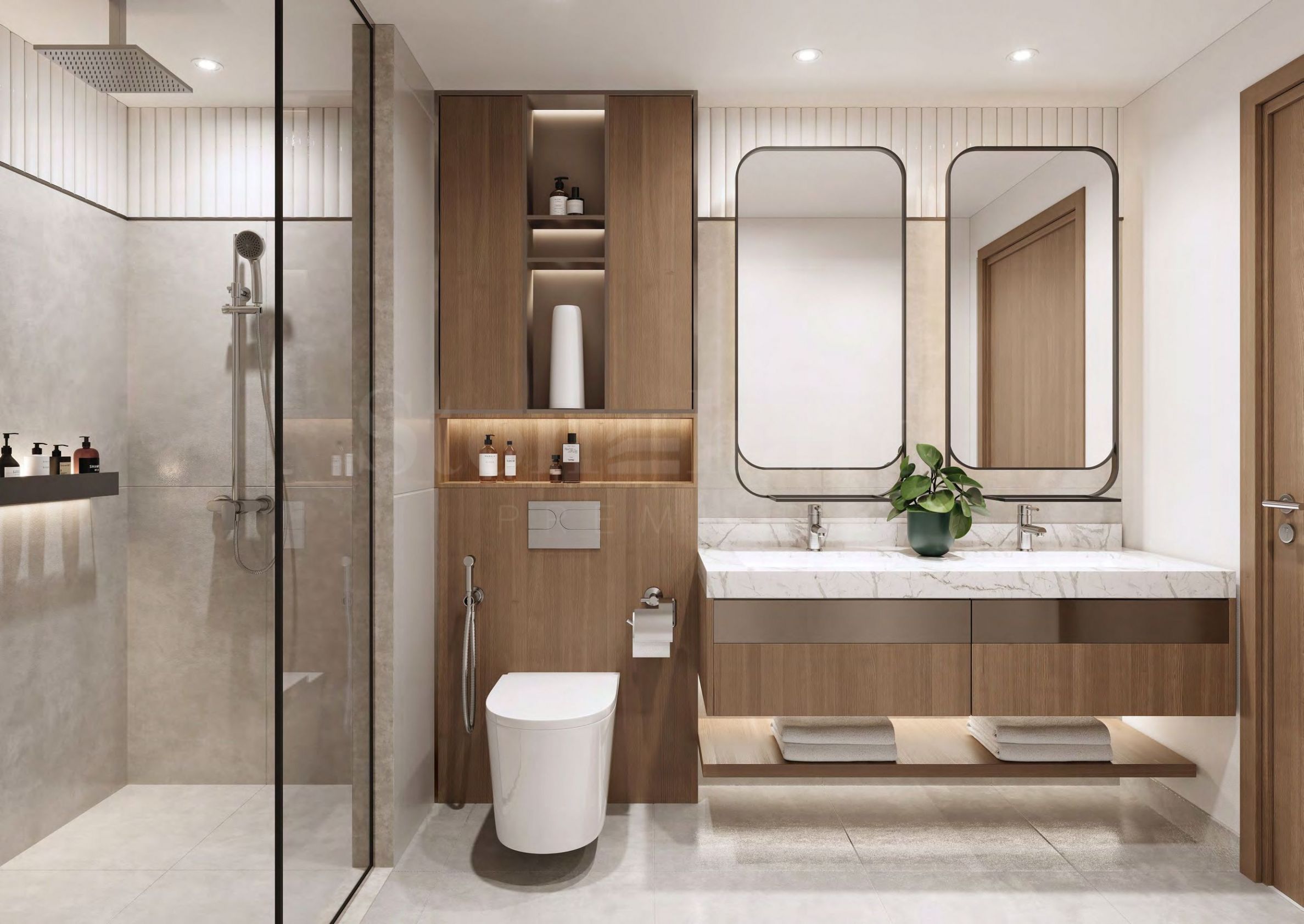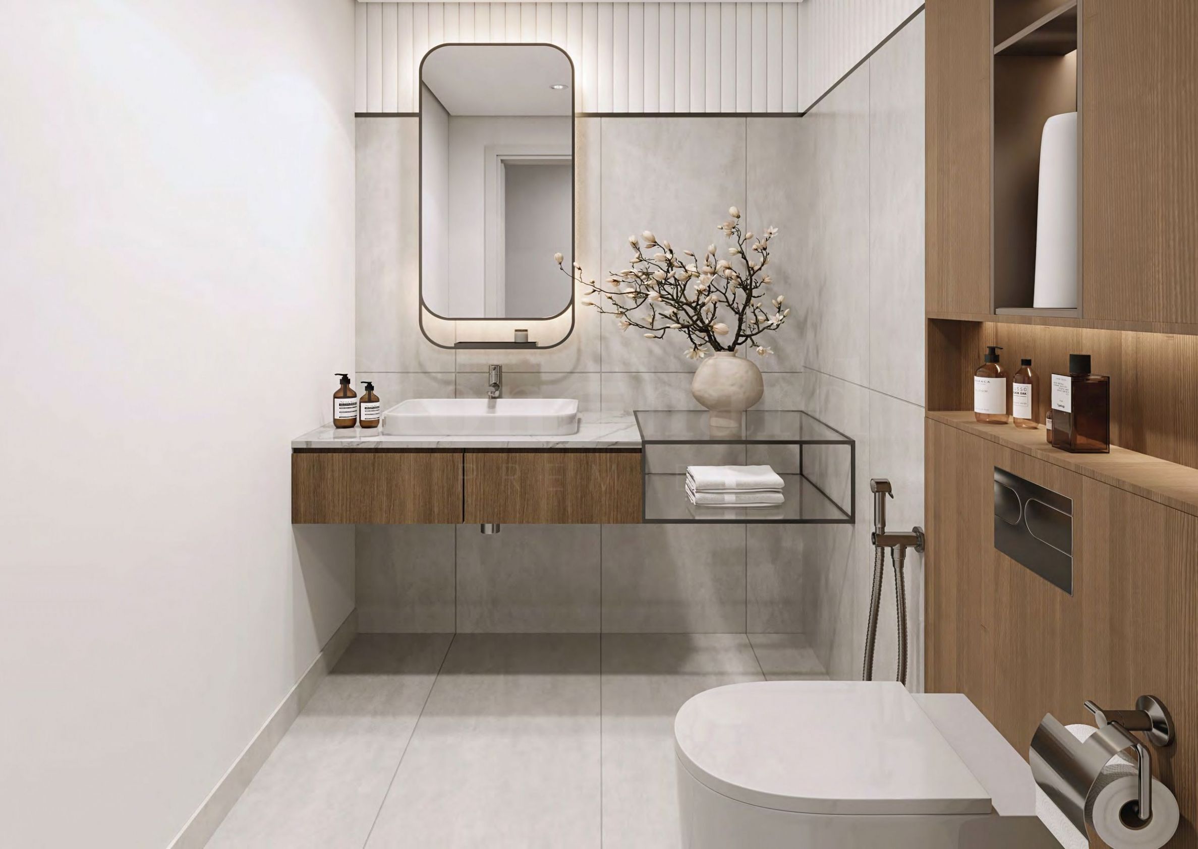 Łazienki zachwycają eleganckimi szklanymi umywalkami, stylowymi szafkami i funkcjonalnie zaprojektowanymi wieszakami na ręczniki. Delikatne oświetlenie podkreśla nowoczesny design, dodając ciepła i tworząc poczucie spokoju. Wysokiej jakości materiały gwarantują trwałość i luksus, dzięki czemu każda łazienka stanowi idealne połączenie stylu i praktyczności.