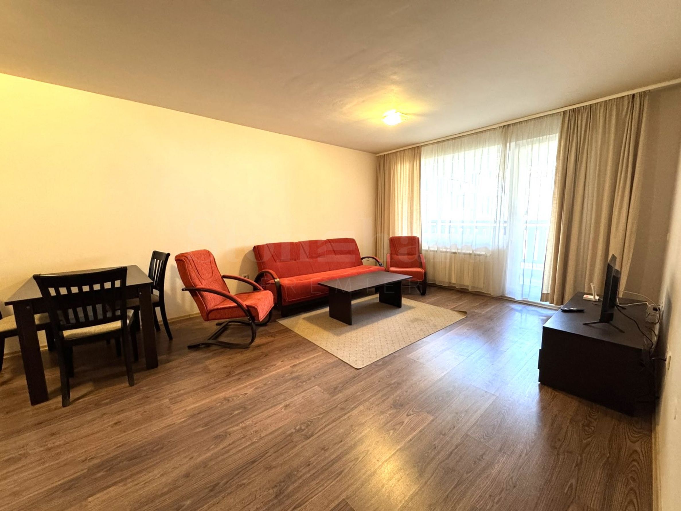 przestronny salon z sofami, TV i balkonem z widokiem na wewnętrzny dziedziniec i góry Pirin;