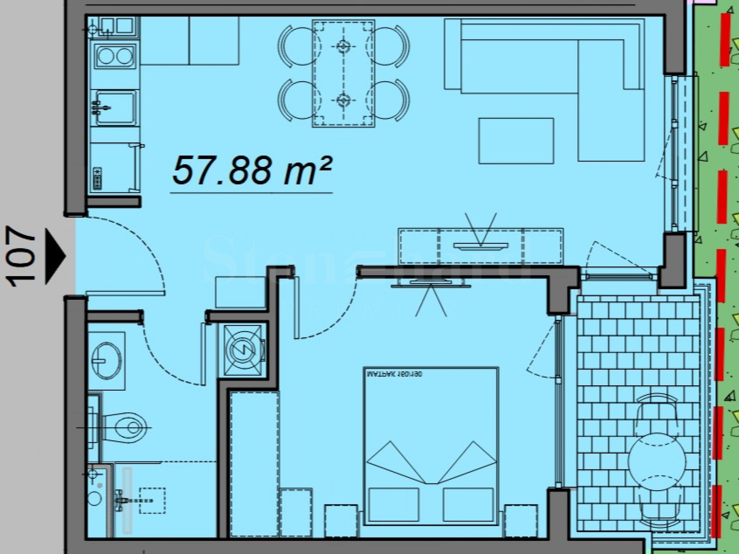 Oferujemy do sprzedaży mieszkanie jednopokojowe w nowoczesnym, innowacyjnym budynku o stylowej architekturze i doskonałej lokalizacji – 300 metrów od szkoły tenisowej i supermarketu, 600 metrów od przystanku autobusowego, 1 km od centrum kurortu, 700 metrów (10 minut spacerem) do plaży i 400 metrów od 4 parków z licznymi atrakcjami dla dzieci.