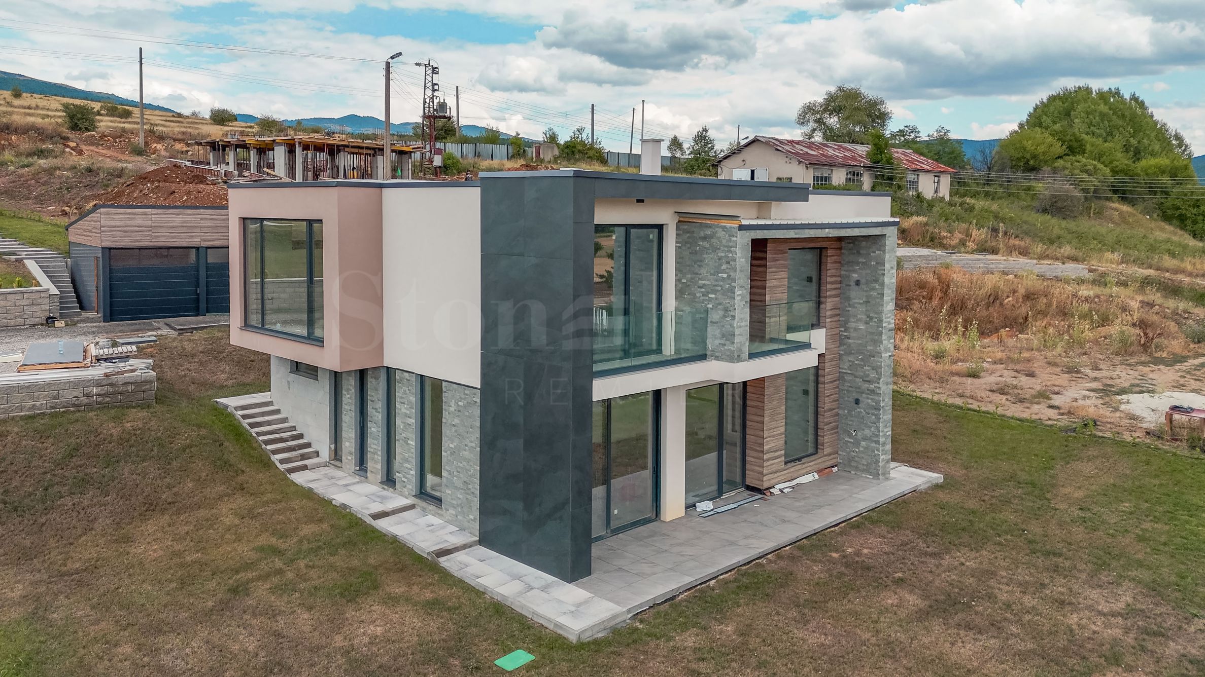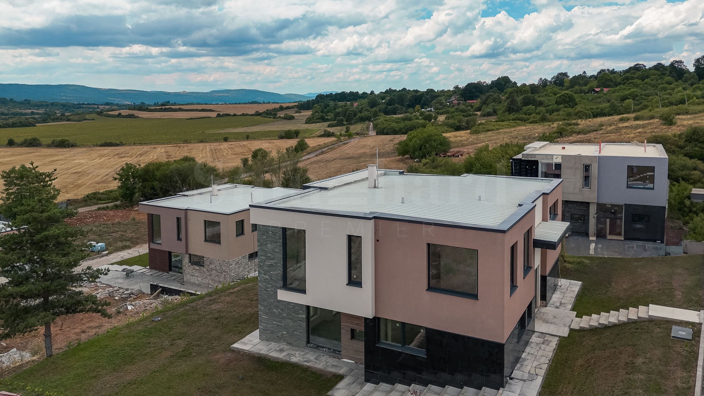 Wizja architektoniczna kompleksu łączy w sobie czyste linie, naturalne materiały, takie jak kamień i drewno, oraz starannie dobrane rozwiązania elewacyjne. Wysokiej klasy izolacja, okna Rehau Geneo z potrójnymi szybami, nowoczesne drzwi wejściowe i niezawodne rozwiązania dachowe gwarantują długotrwałą jakość i energooszczędność. Ogrzewanie zapewnia pompa ciepła i ogrzewanie podłogowe, a wnętrza są otynkowane i wykończone, z możliwością wykończenia „pod klucz” według indywidualnego projektu.