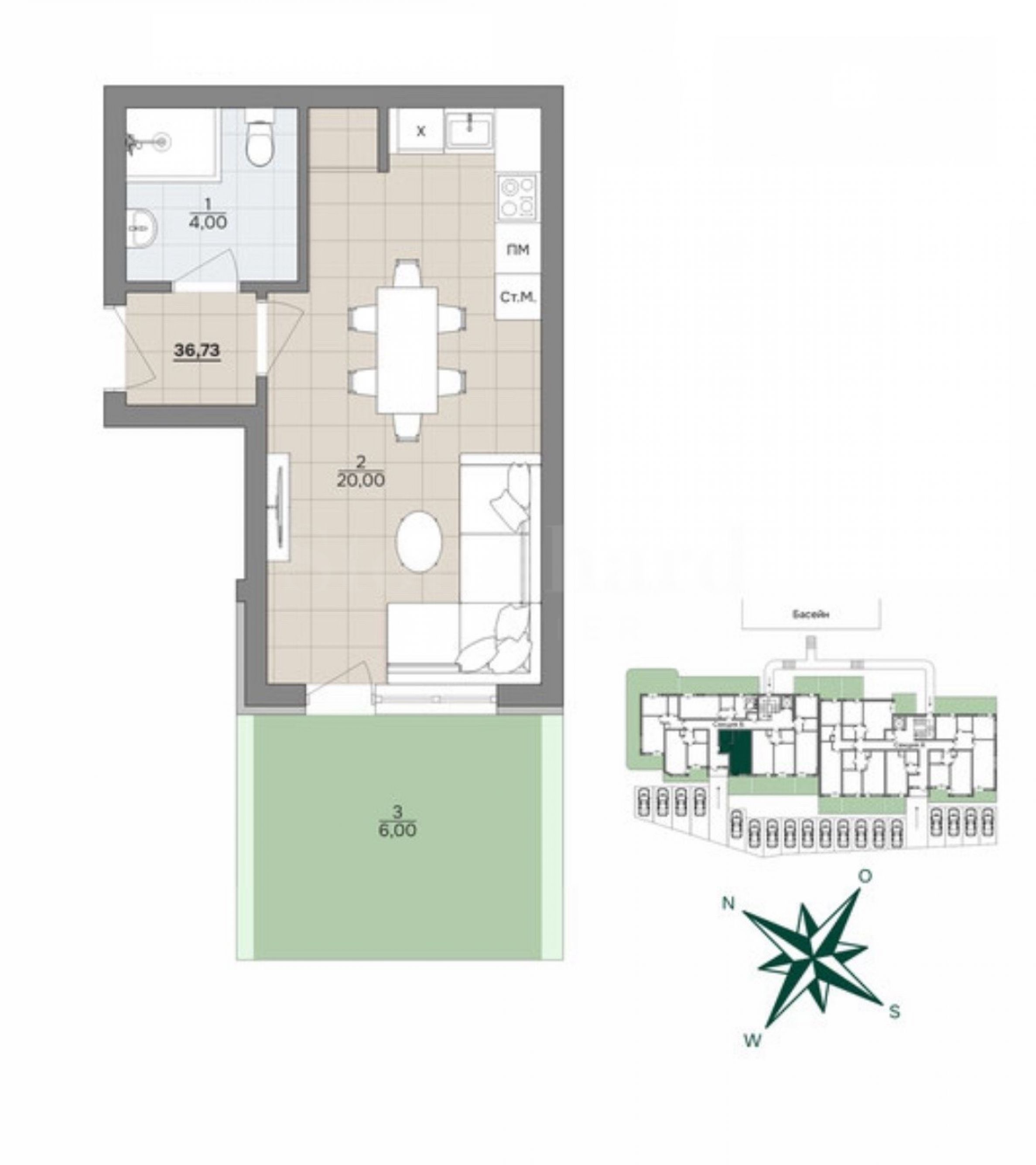 Mieszkanie o powierzchni całkowitej 36 mkw. znajduje się na 1 piętrze z 4 budynków i ma następujący rozkład: