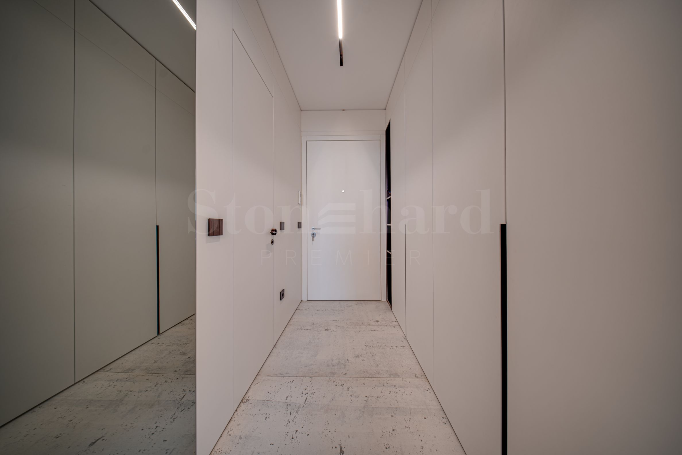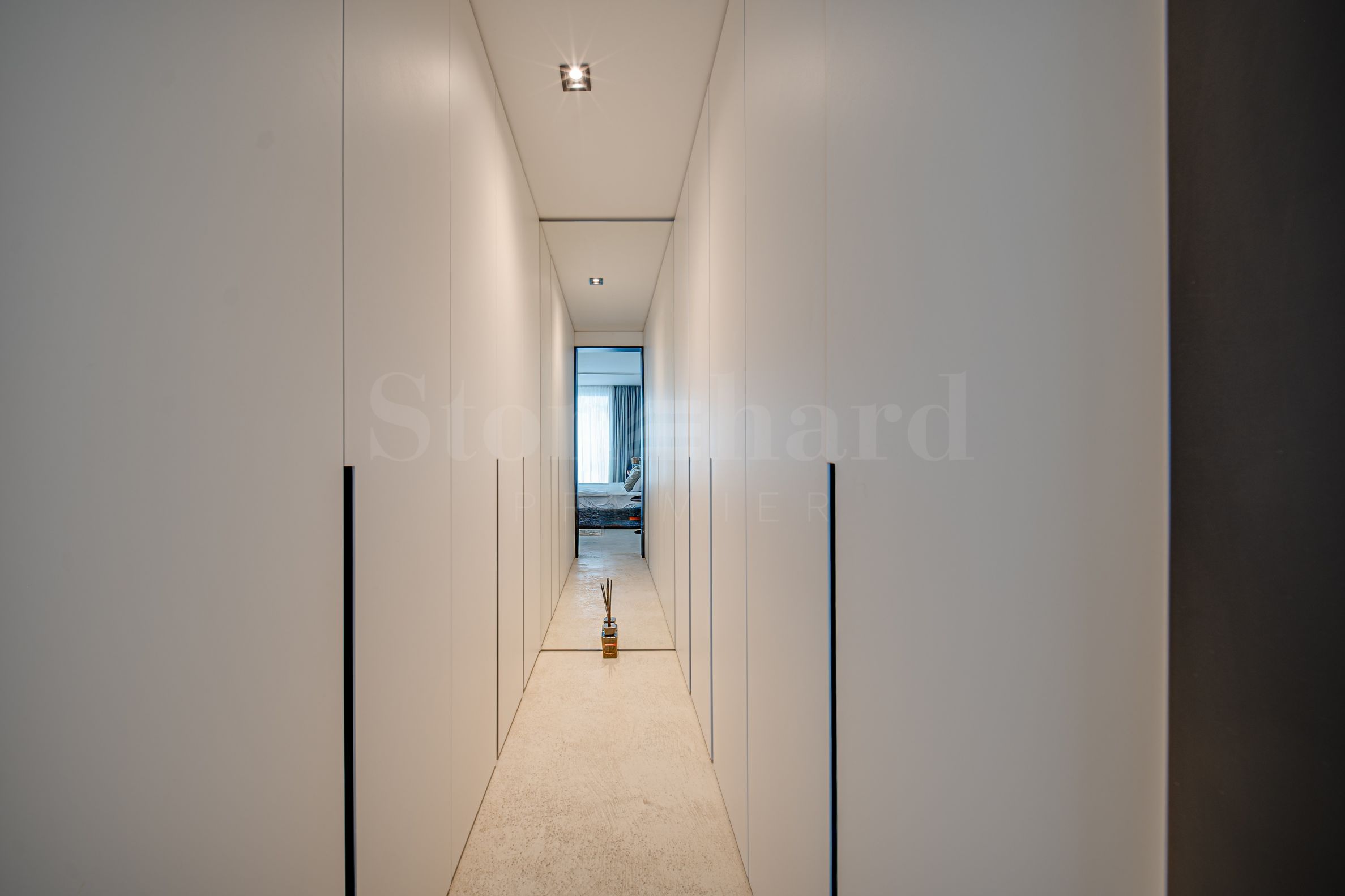 Drzwi pokryte tapetą i wyposażone w zamki magnetyczne nadają wnętrzu wrażenie czystości i spokoju, a oświetlenie austriackiego producenta XAL rozświetla przestrzeń miękkim światłem, które podkreśla linie projektu.