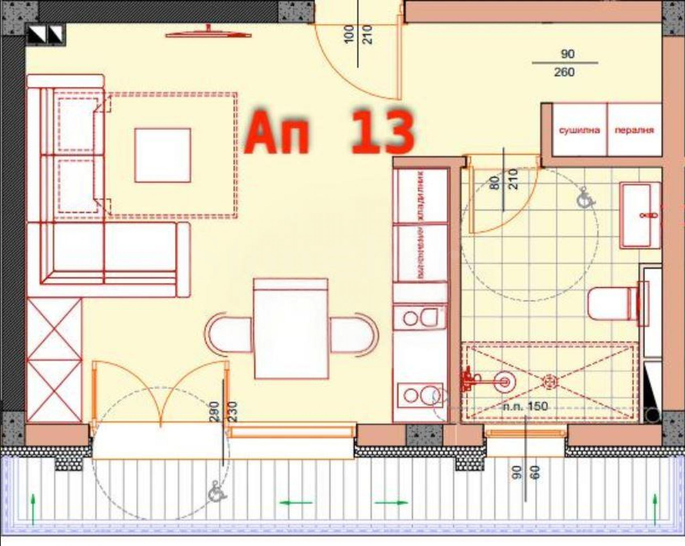 Nieruchomość o powierzchni 48,97 m², położona na 3. piętrze z ekspozycją południową, jest wynajmowana w następującym stopniu wykończenia, zgodnie z bułgarskimi standardami budowlanymi: