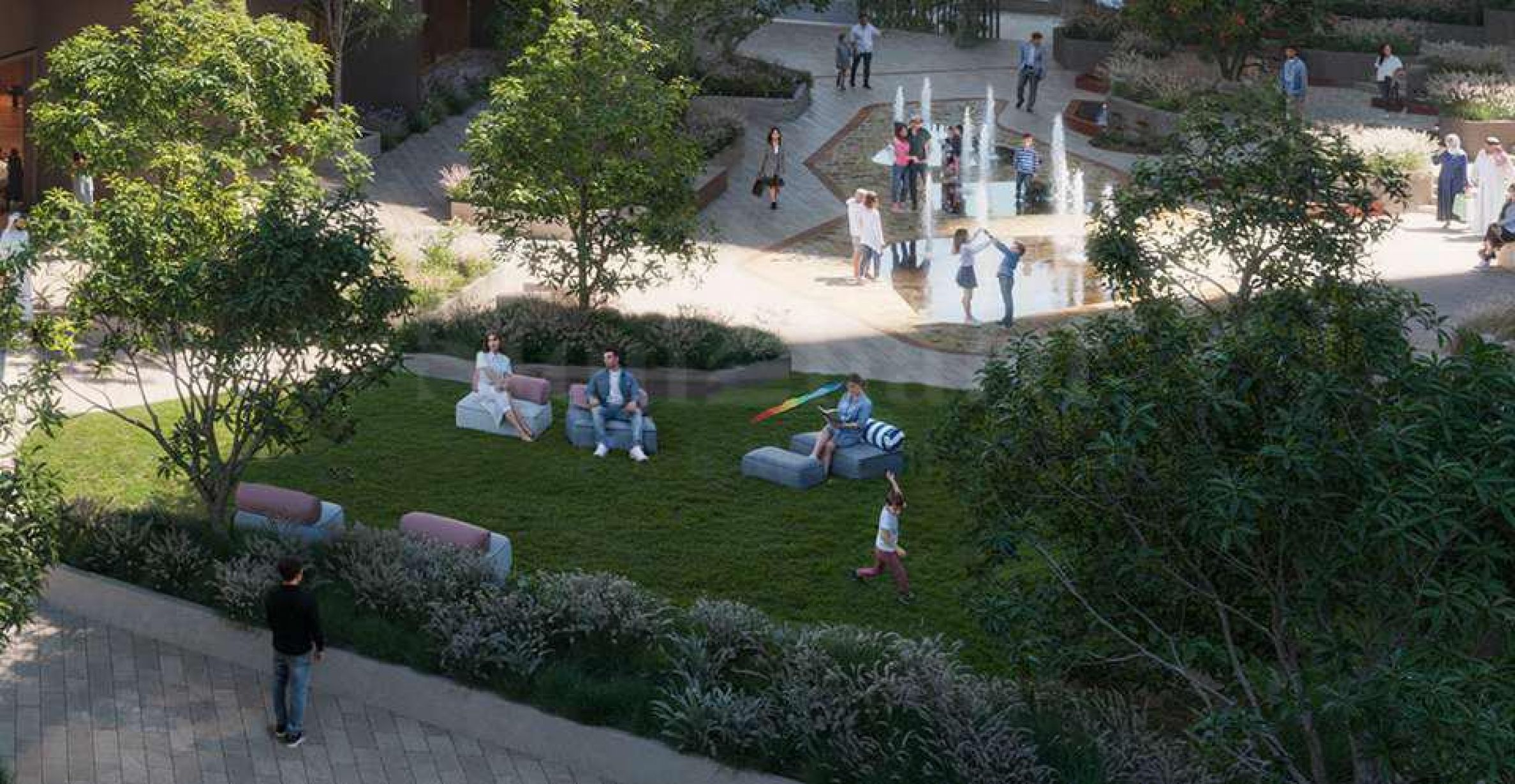 Bujne ogrody z elementami wodnymi, zacienionymi ścieżkami do spacerów i joggingu oraz otwartymi przestrzeniami do jogi i relaksu tworzą harmonijne środowisko życia. W centrum kompleksu znajduje się malownicze jezioro, a ogrody tematyczne z pawiami i imponującym pawilonem motyli dodają wyjątkowego charakteru. Zagospodarowanie terenu ma charakter funkcjonalny – tworzy naturalny mikroklimat o niższych temperaturach niż w otoczeniu, a także stylową przestrzeń do organizacji imprez plenerowych.