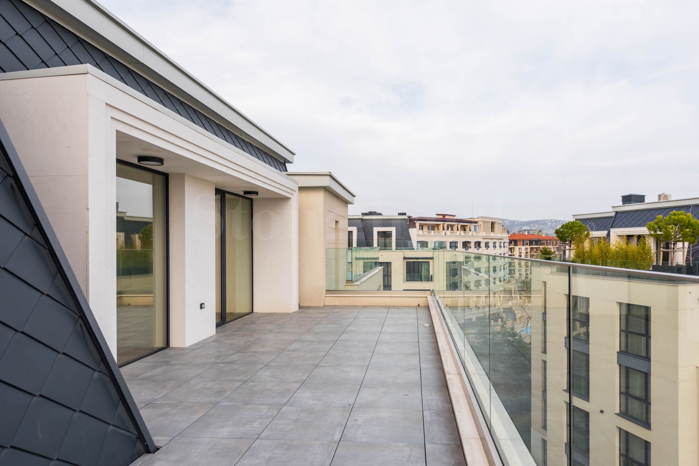 Ta imponująca nieruchomość o łącznej powierzchni 197,61 m² znajduje się na najwyższym, 6. piętrze i posiada dodatkowy taras na dachu o powierzchni 60 m², który nie jest wliczony w całkowitą powierzchnię apartamentu. Do apartamentu przynależy również jedno miejsce parkingowe w garażu podziemnym kompleksu. Z apartamentu roztacza się panoramiczny widok na morze, bogato zagospodarowany teren i baseny kompleksu, a także na nowe osiedla mieszkaniowe w pobliżu.