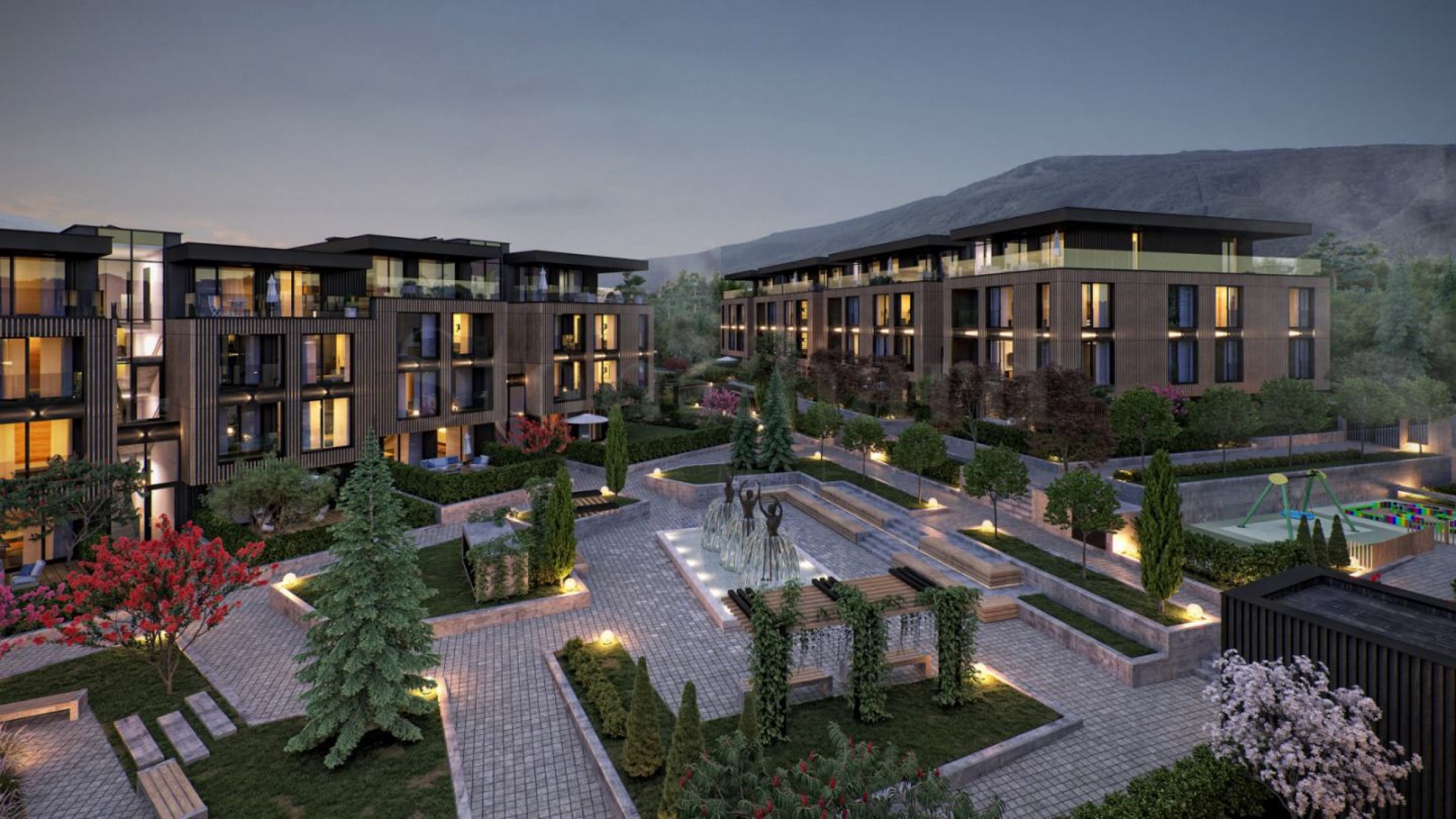 Kompleks jest ogrodzony, otoczony bujną zielenią, parkiem, miejscami rekreacyjnymi i placem zabaw dla dzieci. Samochody znajdują się całkowicie pod ziemią, więc podwórka i alejki pozostają do dyspozycji mieszkańców.