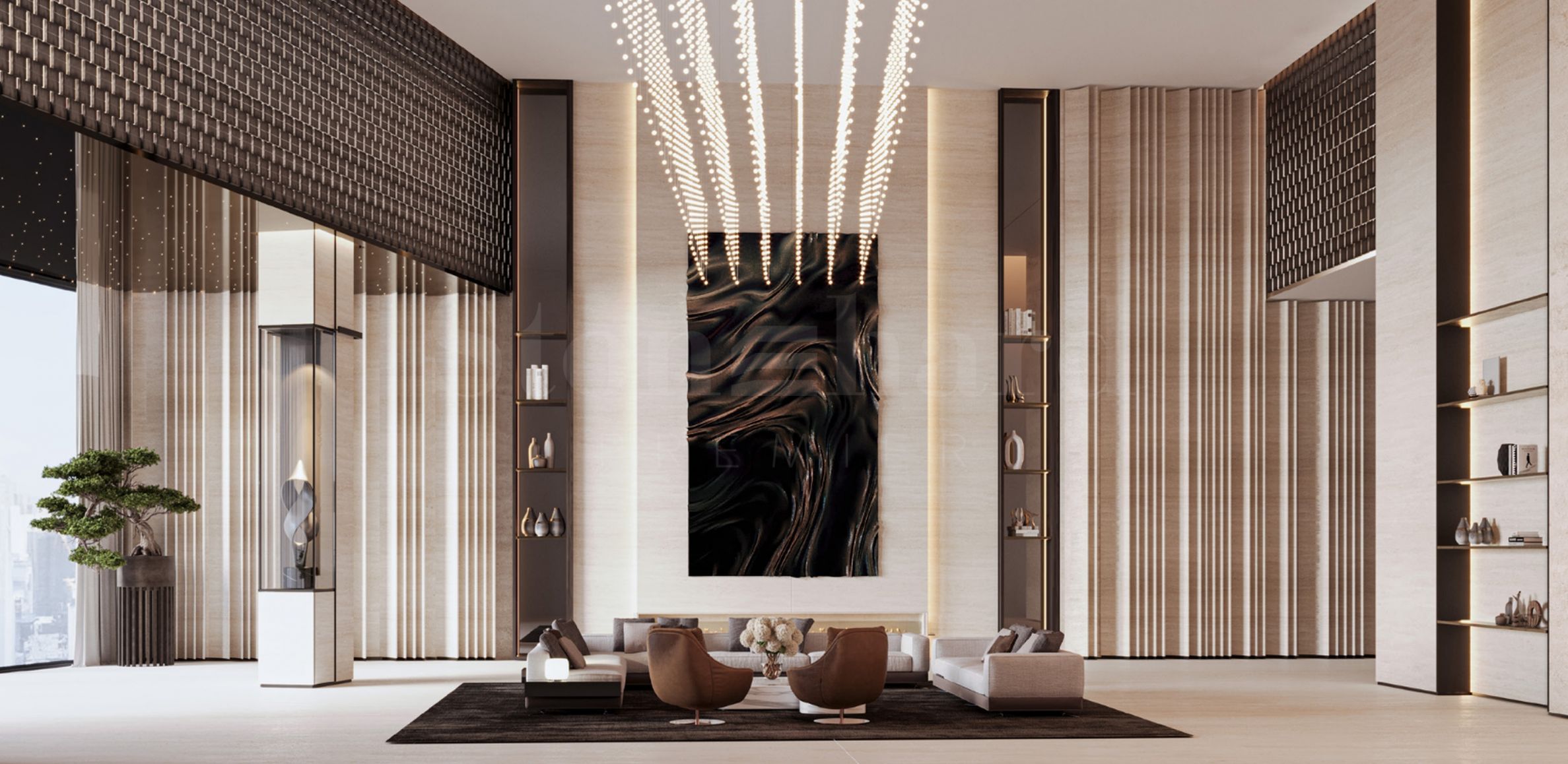 Budynek One by Binghatti wznosi się na imponujące 67 pięter, stając się charakterystycznym akcentem w panoramie okolicy nie tylko swoją wysokością, ale również artystycznym oświetleniem elewacji, które elegancko podkreśla dekoracyjne linie i architektoniczną tożsamość budynku. Po przybyciu na miejsce, mieszkańców i ich gości wita imponujące lobby z recepcją, wyróżniające się imponującą wysokością, przestronnością i poczuciem reprezentacyjności. Rozwiązania wnętrz w częściach wspólnych zostały dobrane z dbałością o detale, łącząc marmur, naturalne drewno, trawertyn oraz wykwintne akcenty z brązu i szkła, tworząc atmosferę współczesnego luksusu.