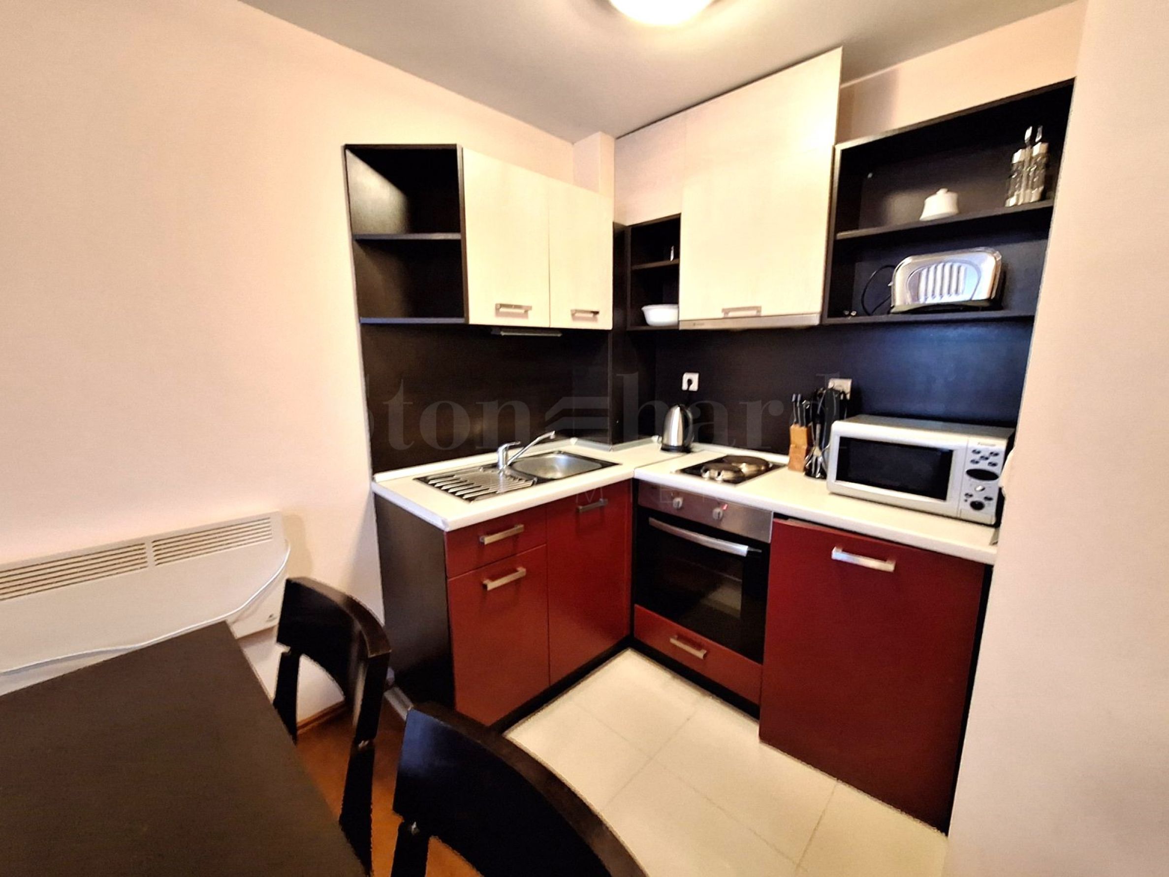 • Kuchnia wyposażona jest w kuchenkę elektryczną, lodówkę, mikrofalówkę, toster, czajnik elektryczny;