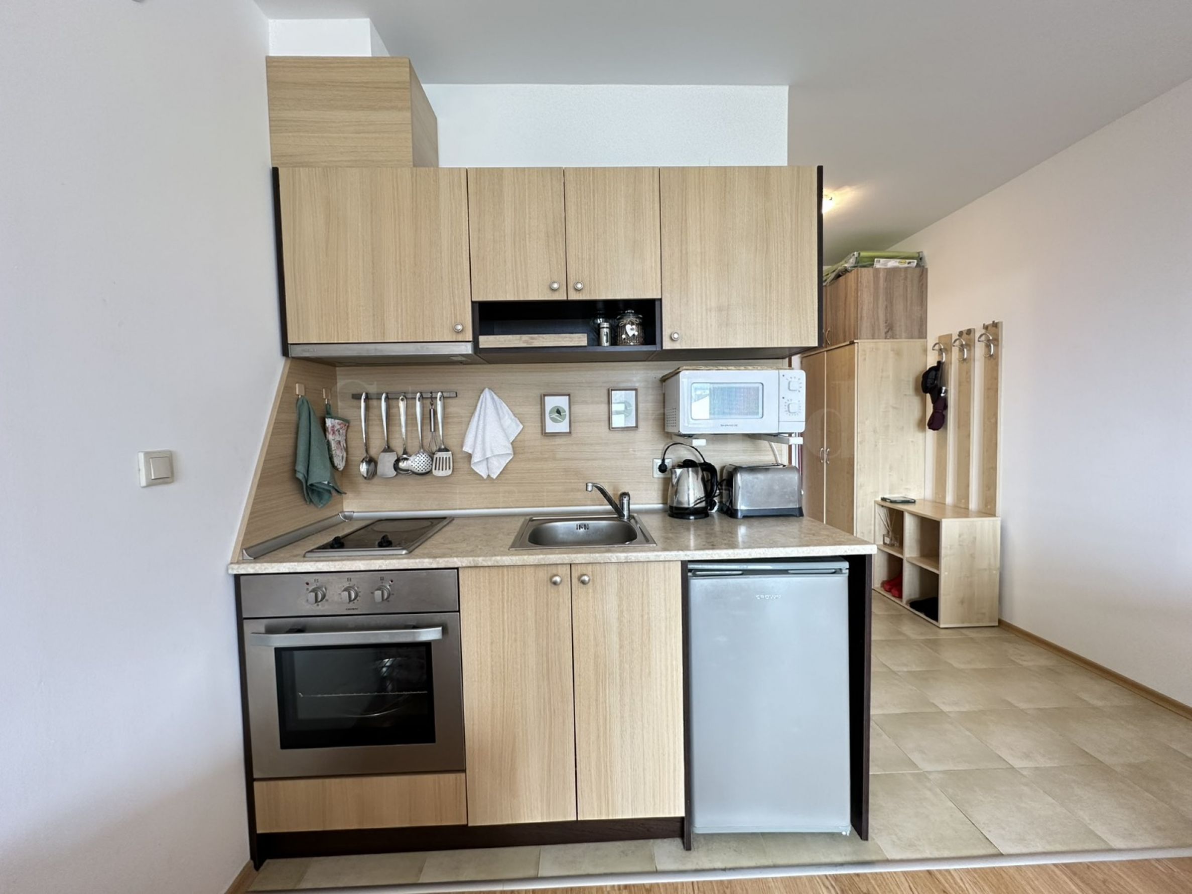 Nieruchomość składa się z: przedpokoju, pokoju dziennego z sypialnią, fotelem, stołem jadalnym, aneksem kuchennym, balkonu oraz łazienki z wanną i toaletą.