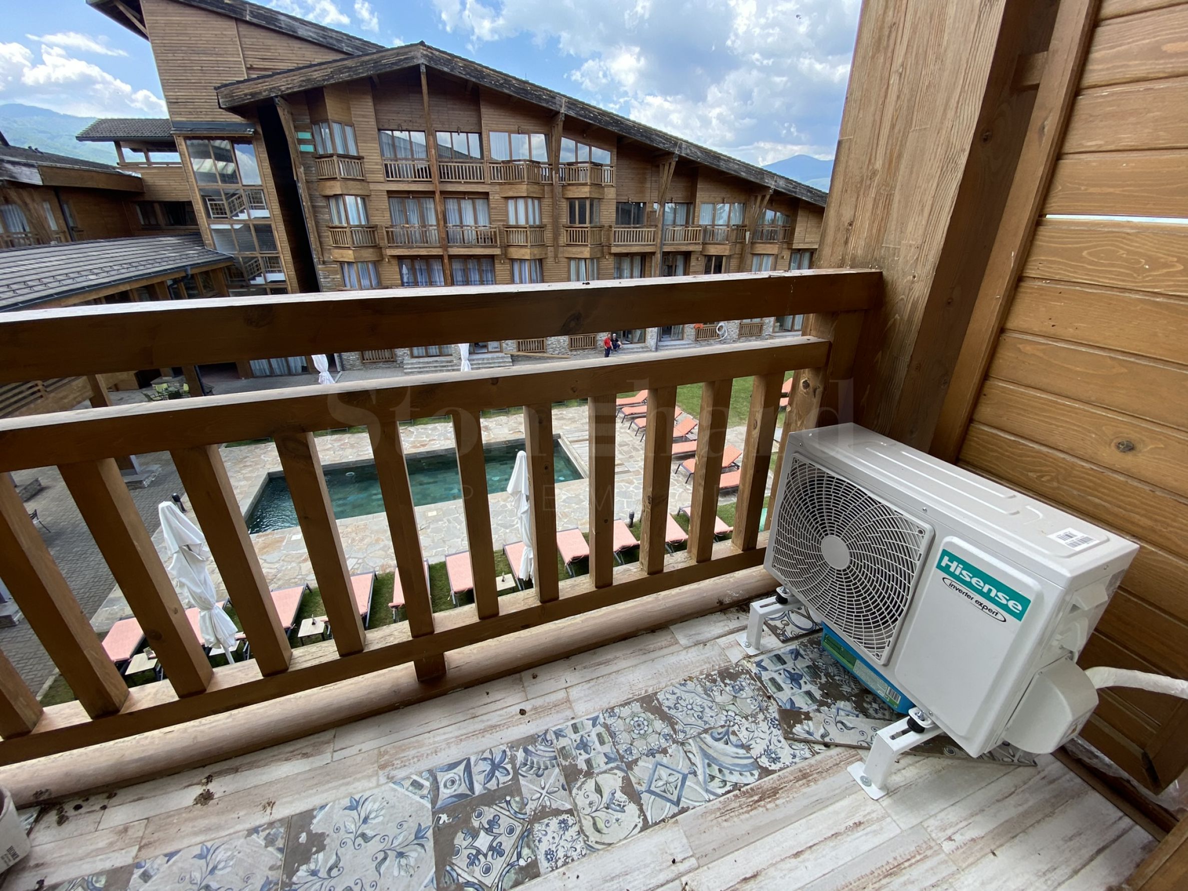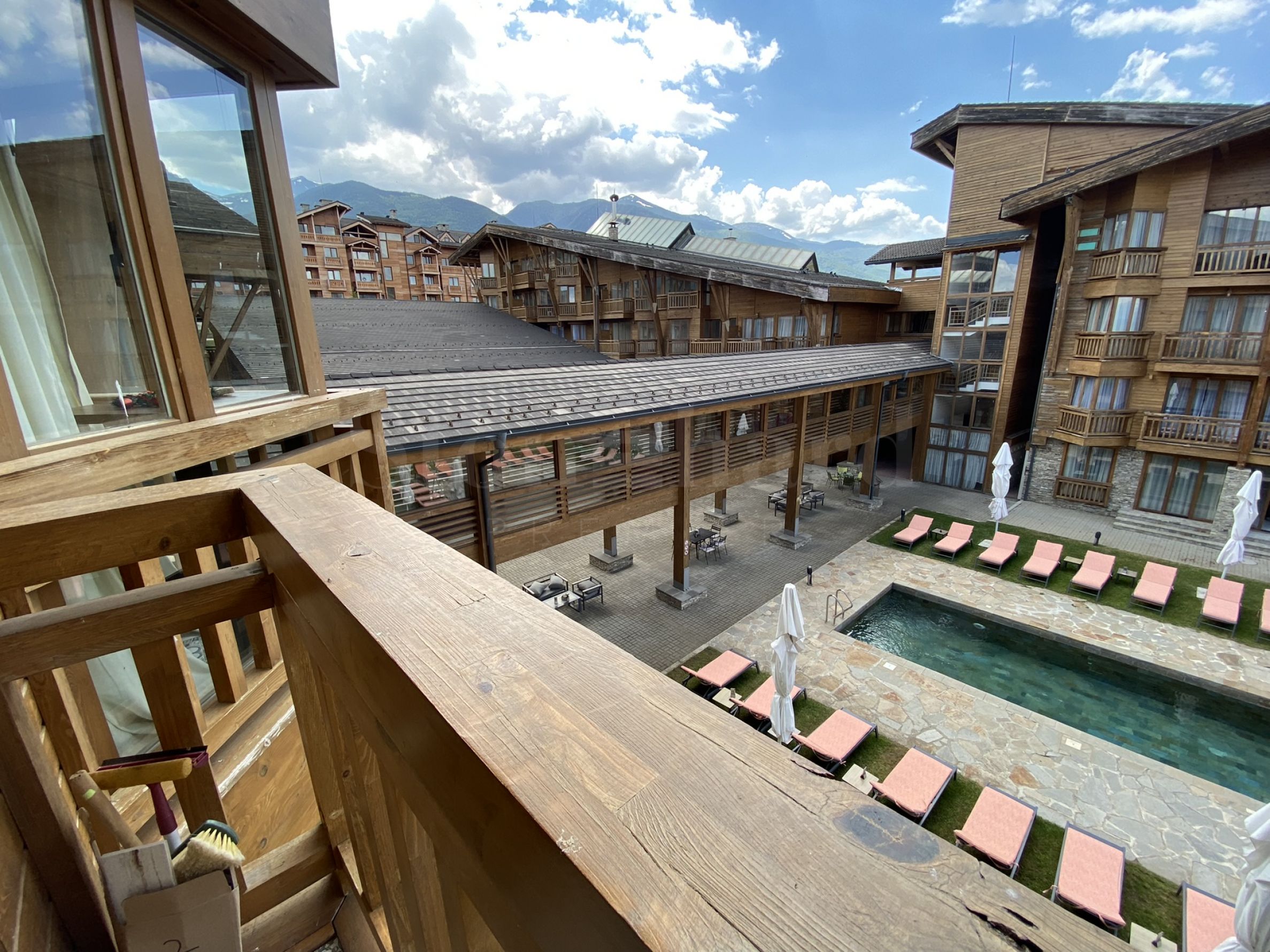 The apartment offers beautiful views of the mountain and the outdoor pool of the complex.