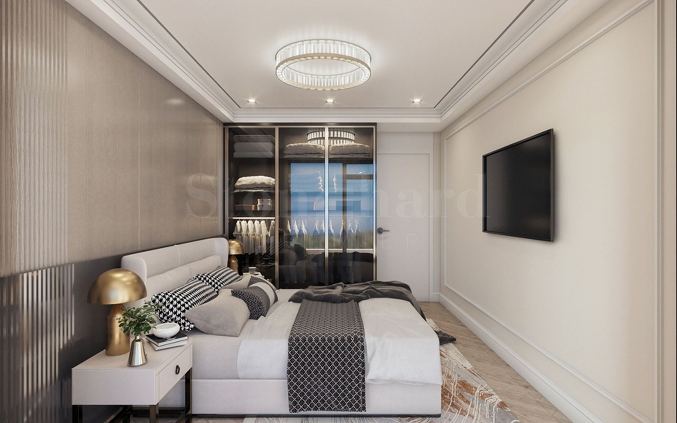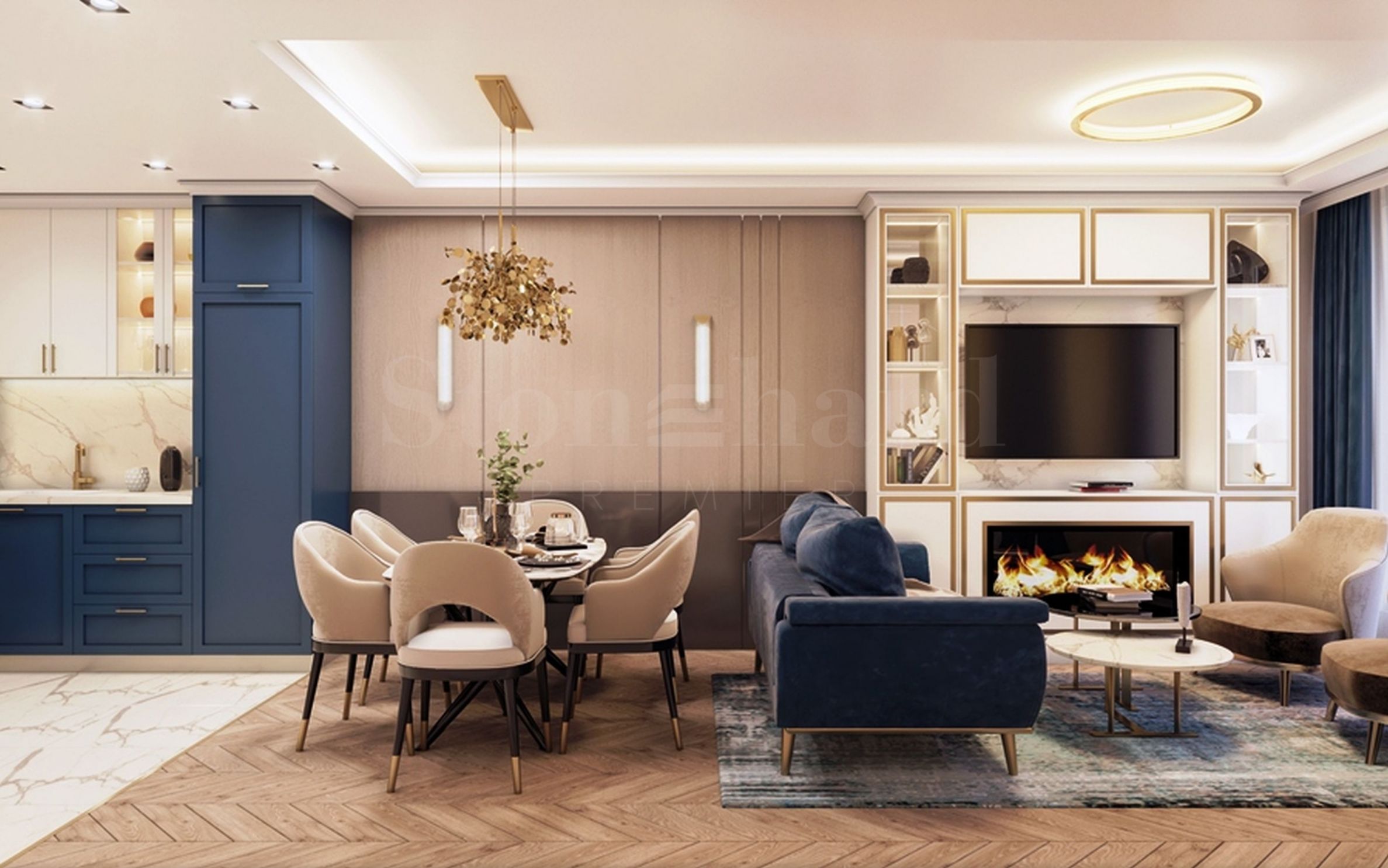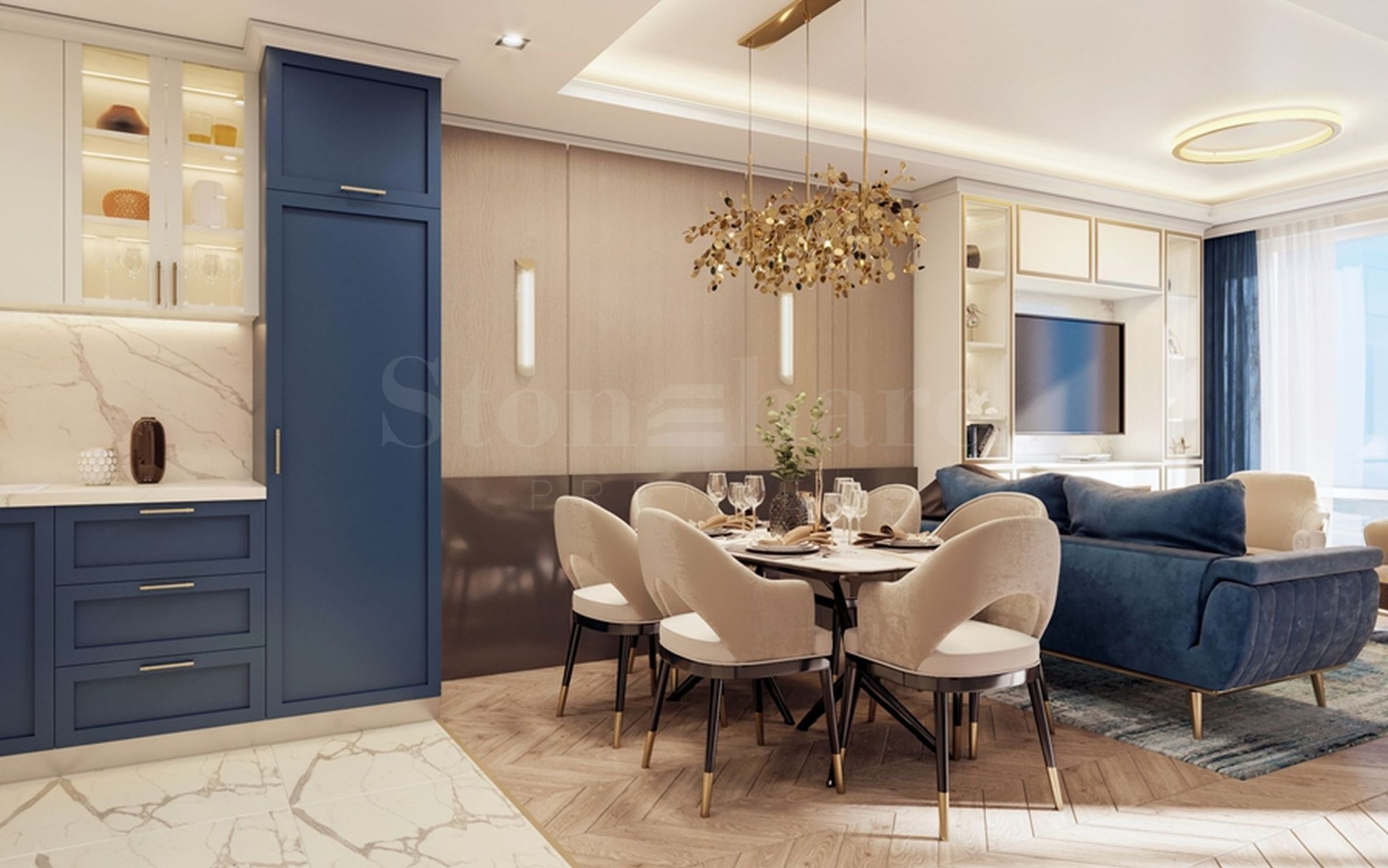 It is possible to finish the properties "turnkey" and fully furnished according to a boutique design project for an additional fee. The project is provided as a bonus, there are also options for furniture. Blue and golden beige colors are used for accent. The bathroom is in a classic style, with beige marble tiles, as in the photos with this offer.