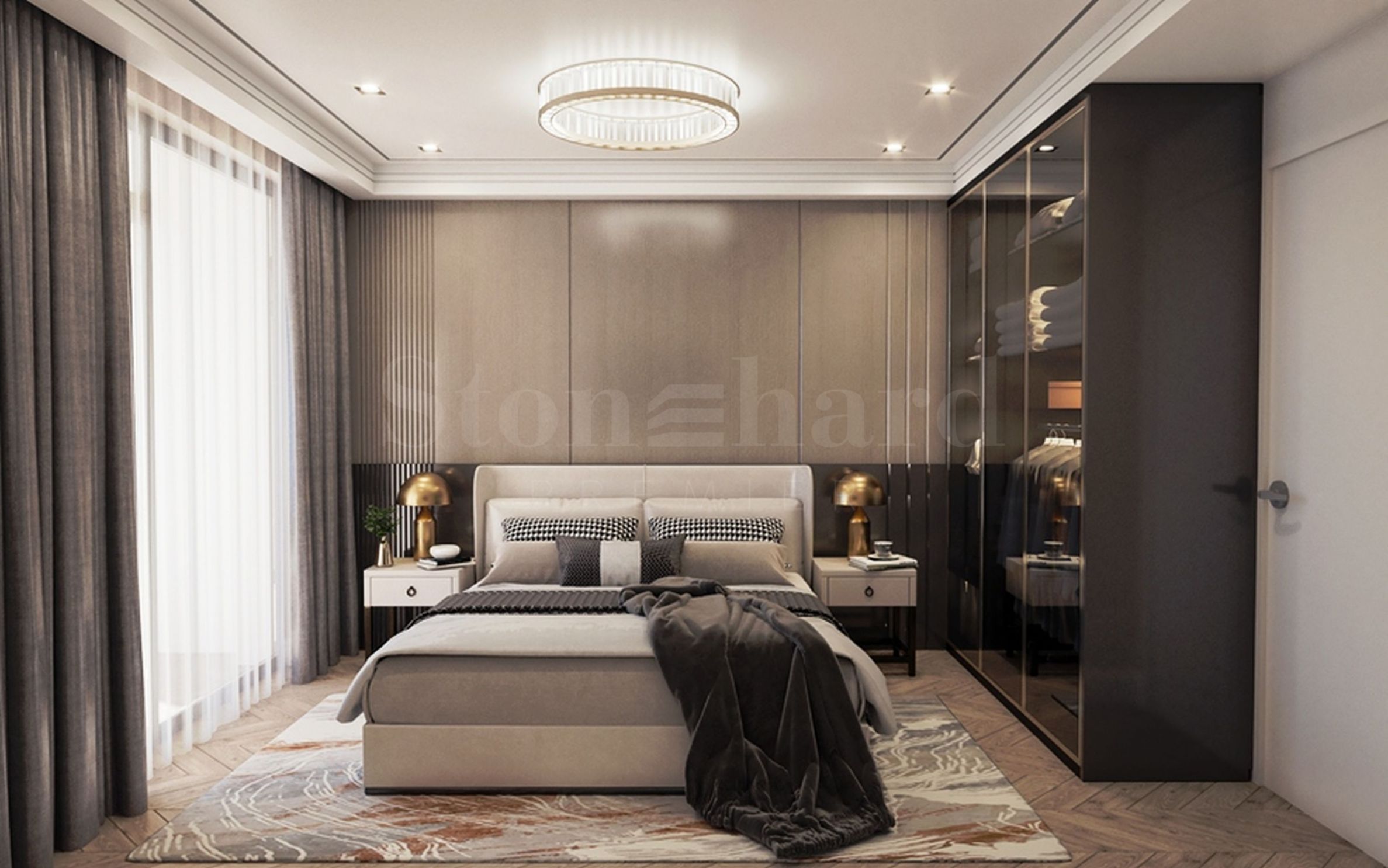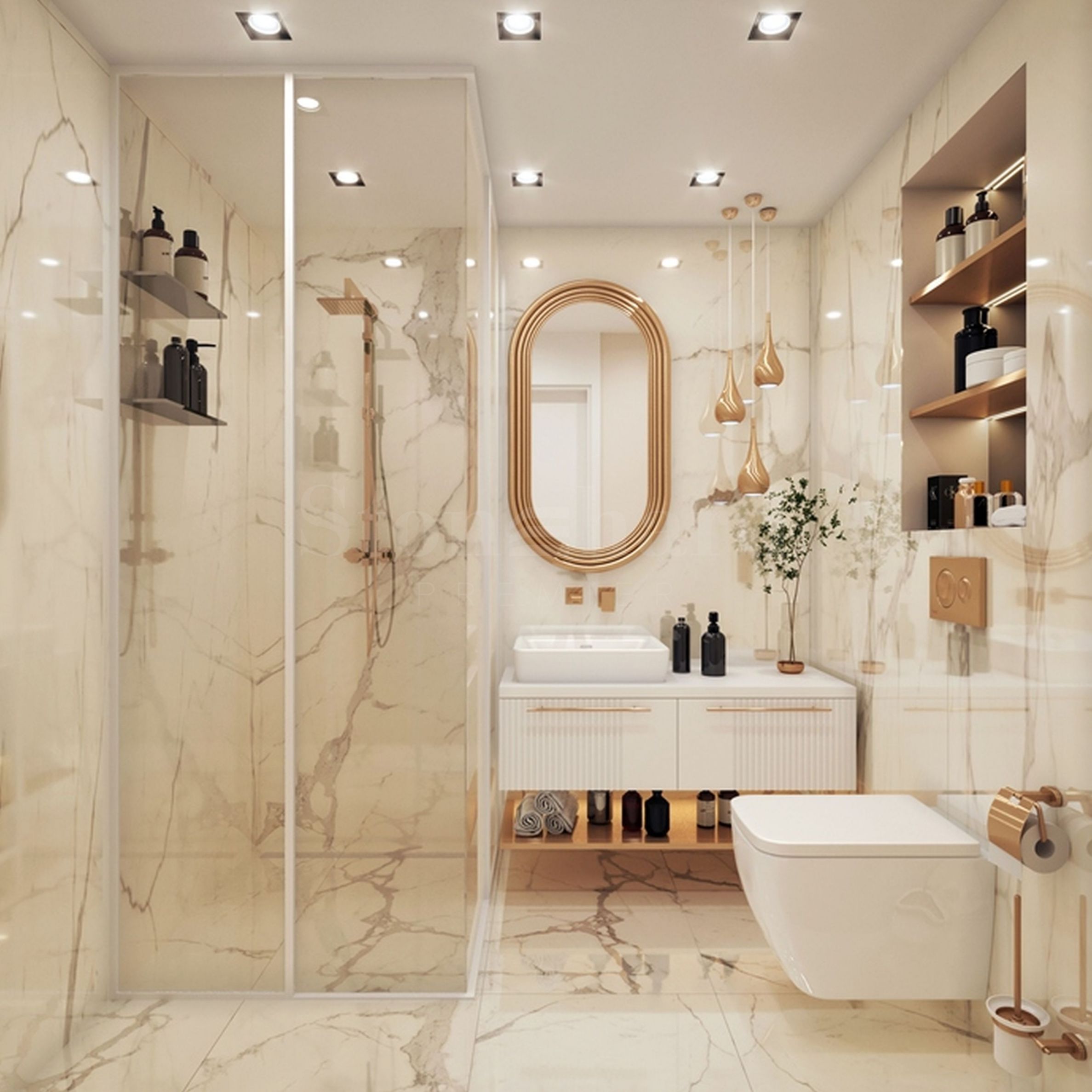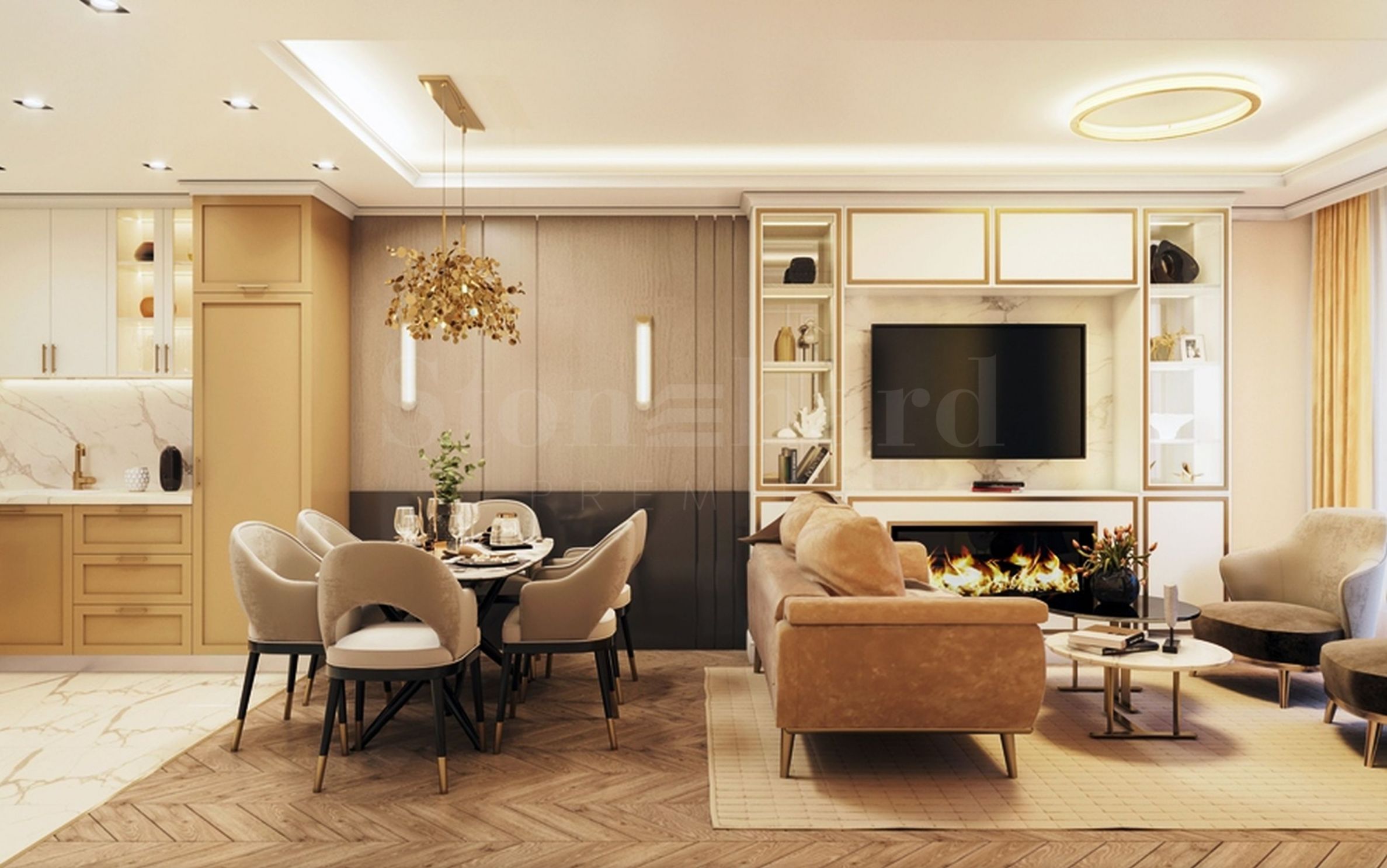 It is possible to finish the properties "turnkey" and fully furnished according to a boutique design project for an additional fee. The project is provided as a bonus, there are also options for furniture. Blue and golden beige colors are used for accent. The bathroom is in a classic style, with beige marble tiles, as in the photos with this offer.