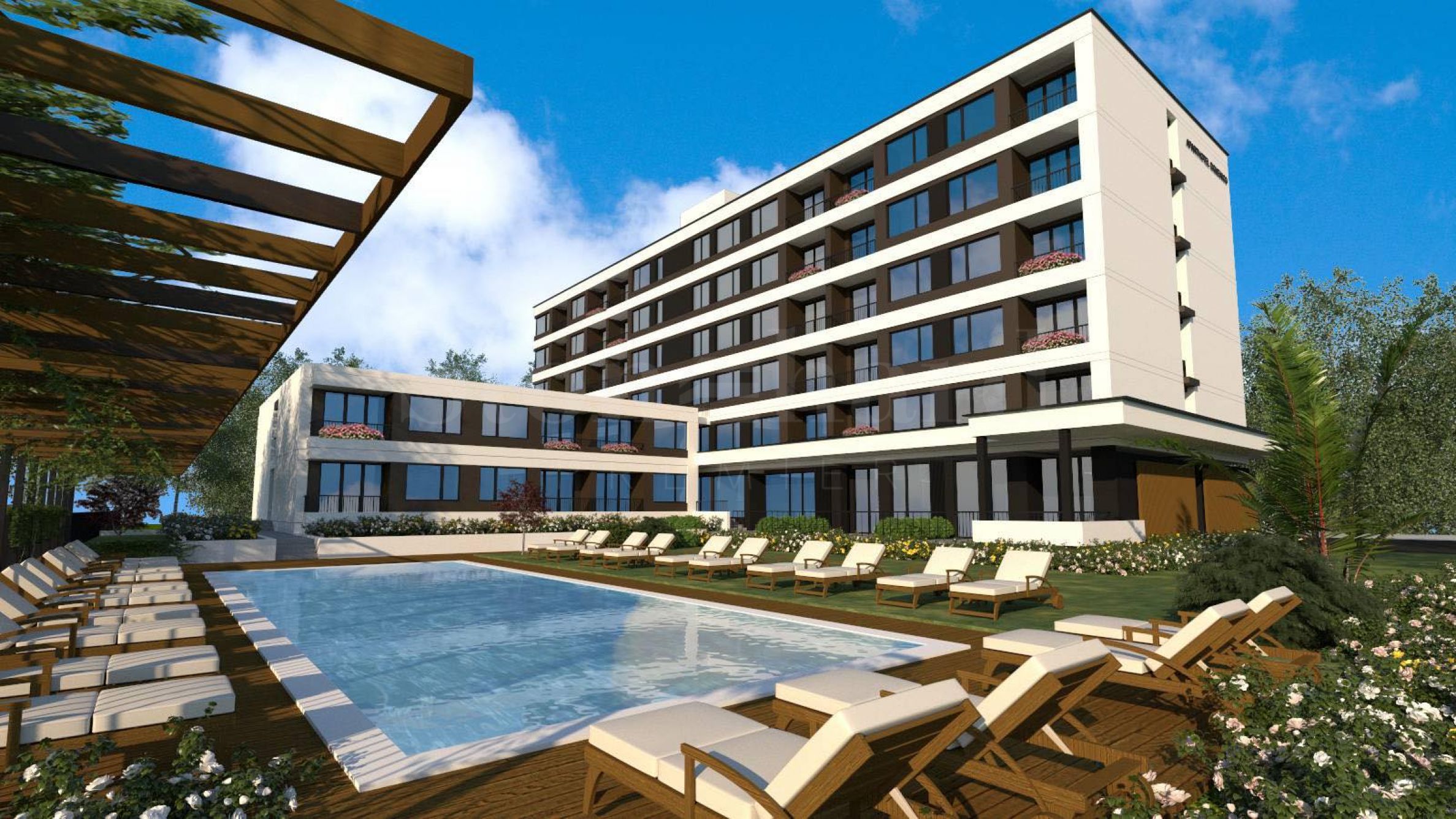 The apart-hotel has a built-up area of 4775.02 m2. It consists of two buildings positioned in close proximity to each other. One is smaller, on 2 floors, and the larger one is spread over 6 levels. There are a total of 82 properties, of which 2 studios, 12 three-room and 68 two-room apartments. On the territory of the complex there will be landscaped common areas, a swimming pool, also suitable for children, a children's corner, a lobby bar that will offer light snacks and a parking lot for the owners with a total of 50 parking spaces. The complex will have 24/7 video surveillance, security and reception.