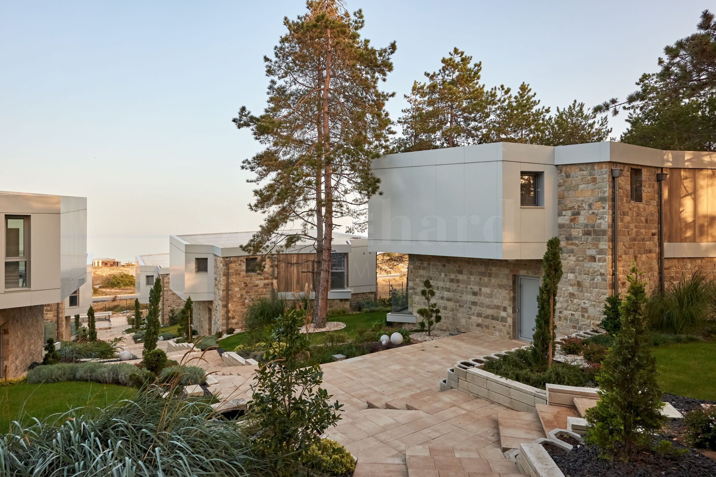 The complex has a fence, and access will be through an automatic barrier. Parking will take place in the lower part of the complex, and access to the houses is via a central alley, with ramps provided for convenient movement. In the upper part, where the complex is quiet and surrounded by pine trees, there is a relaxation area and children's facilities, for games for the whole family, a barbecue and an outdoor dining and entertainment area, with pleasant views of the sea. The yard space will be landscaped and supplemented with spectacular lighting.