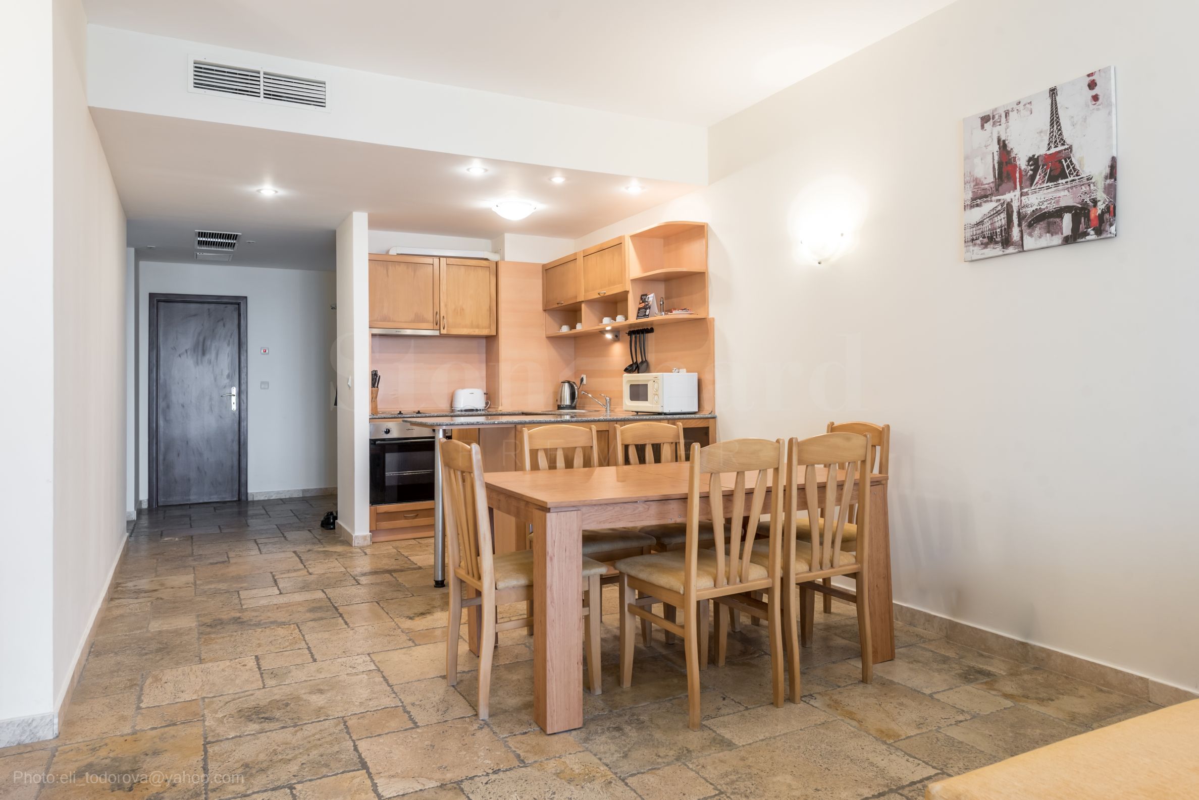 The apartment is equipped with air conditioners, has quality two-chamber joinery, excellent thermal insulation and natural stone floors.