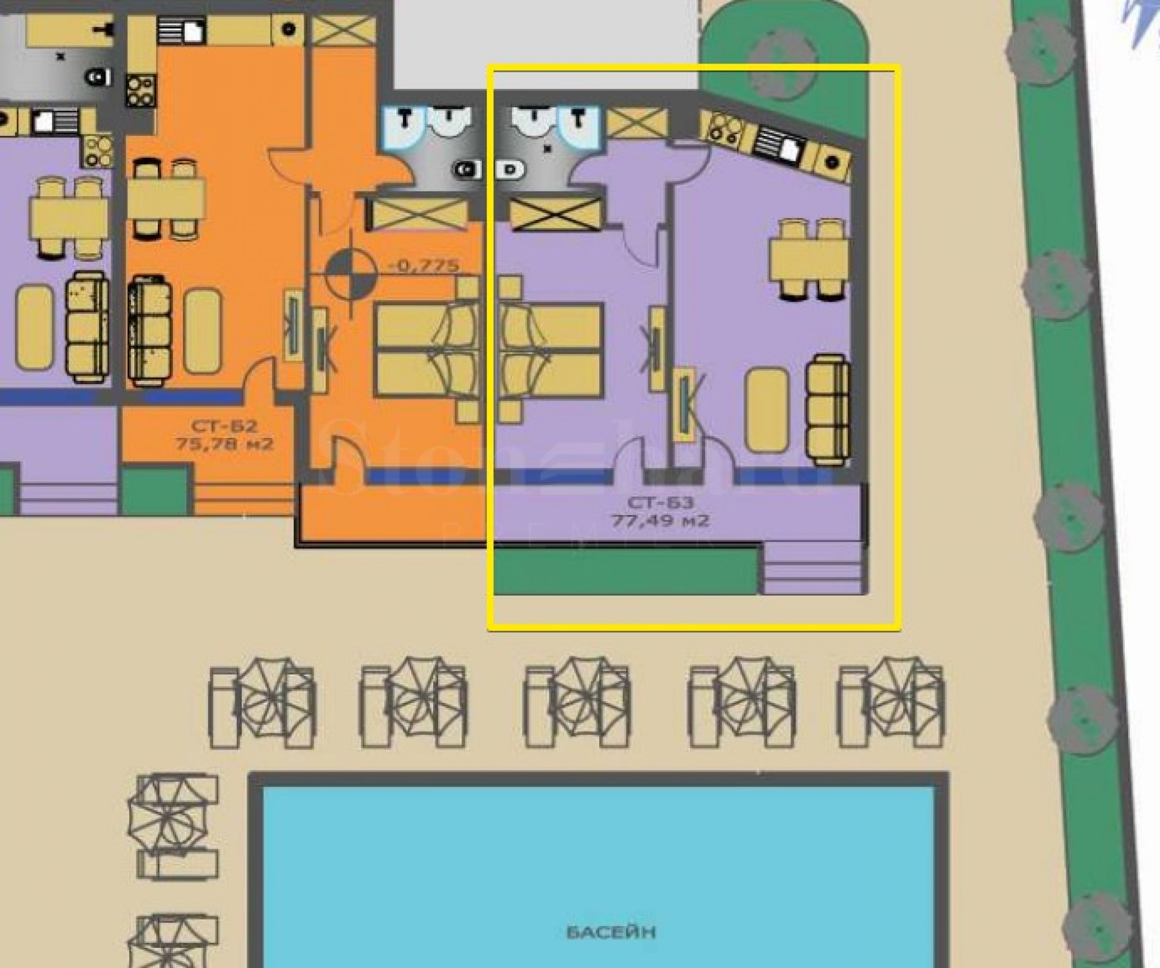 The apartment of 76.15 m2 is located on the 1st floor. Sold with furniture and appliances, ready to use. It consists of an entrance through a veranda, a living room with a kitchen, a bedroom, a bathroom/toilet. *The photos of the furniture attached to the ad are examples, common to the complex.