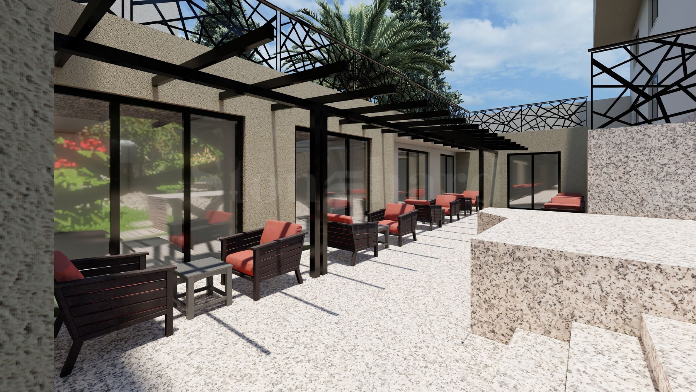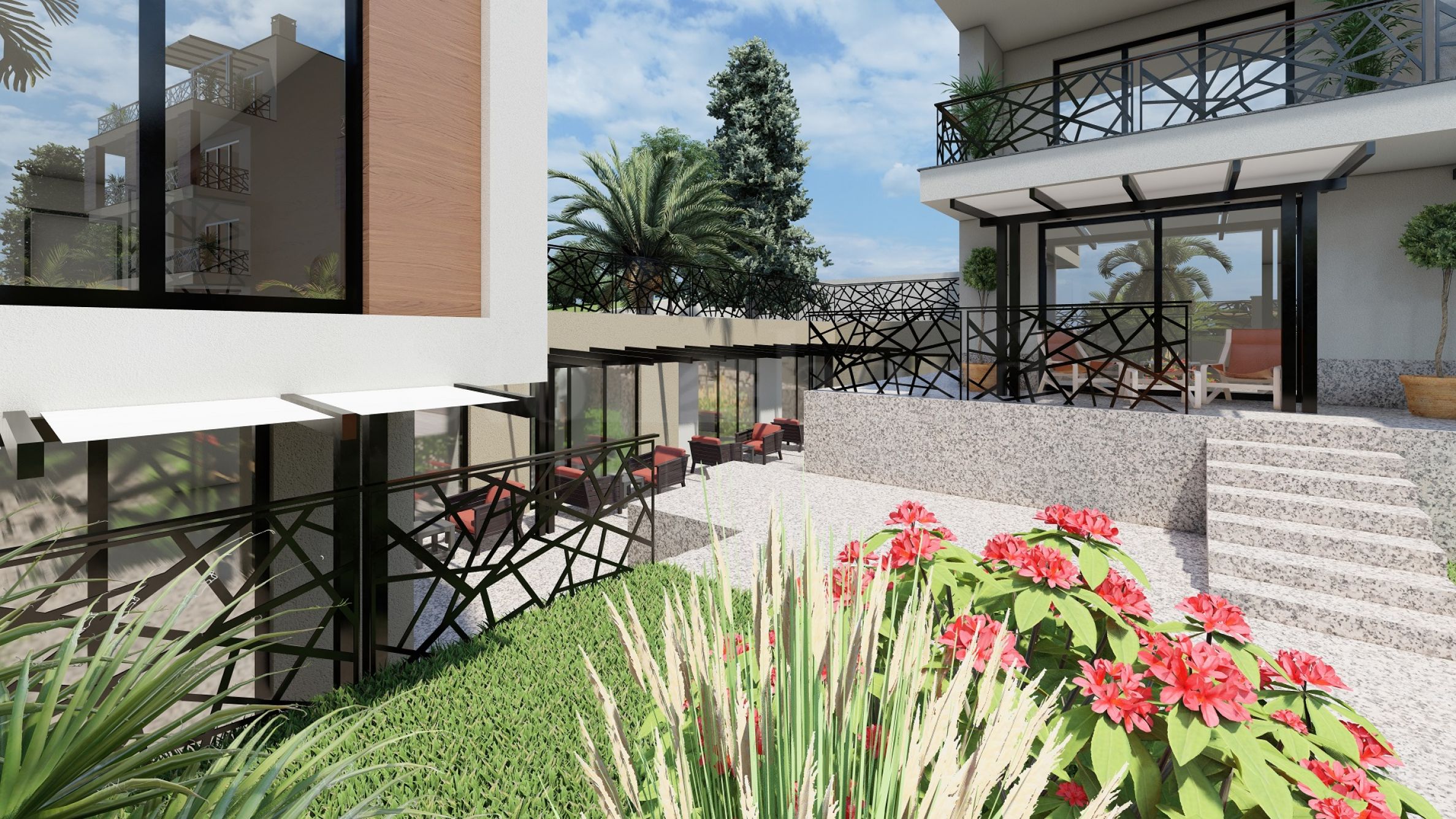 The complex has convenient access, rich landscaping and parking spaces. Apartments on the first levels have private courtyards and verandas.