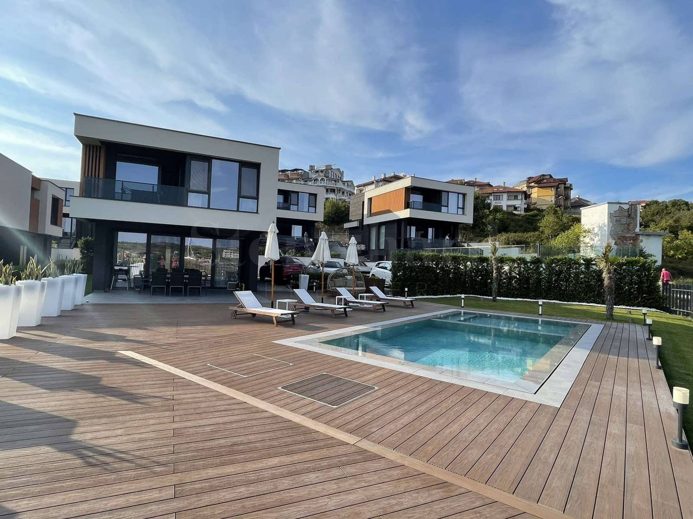The complex in which the house is located is designed in the modern architectural style, with minimalistic shapes, straight lines and futuristic accents. The villas stand out with steel gray facades, elements of wood, panoramic windows providing an abundance of natural light and views, autonomous access and pools on the grounds. 8 modern and originally built houses fascinate with the incredible view of the sea, and the greenery of the surrounding environment contributes to the harmony with nature - an increasingly sought-after criterion for the dream home by the sea!