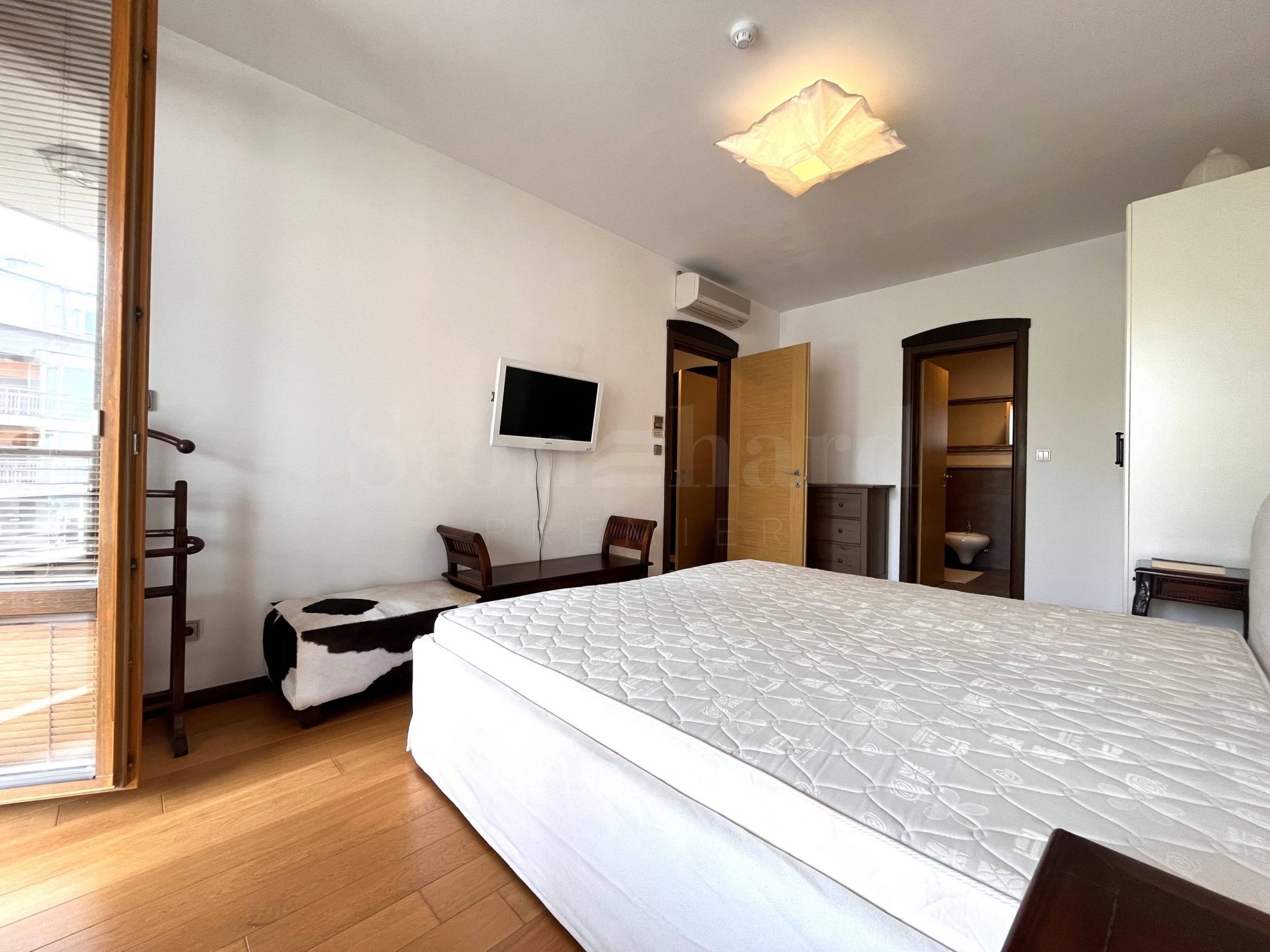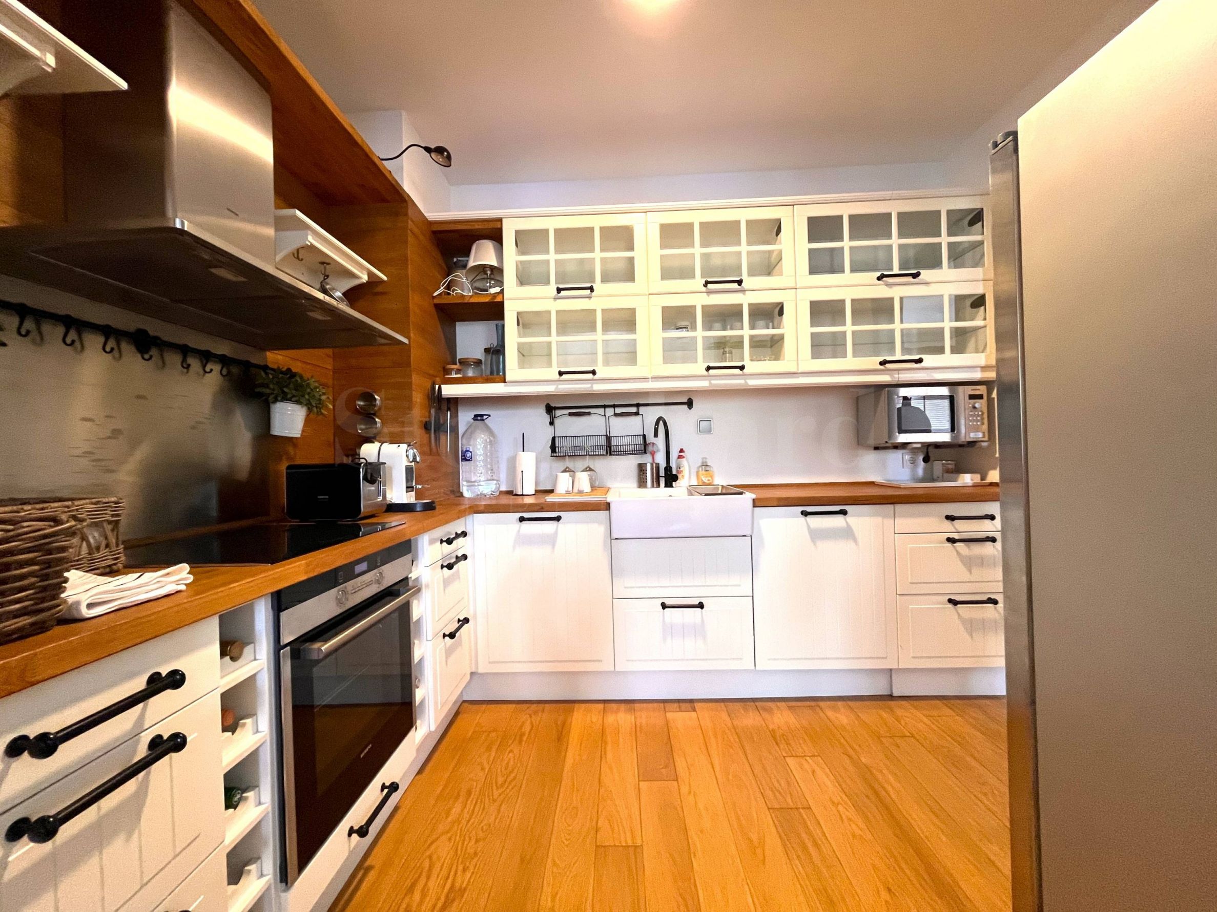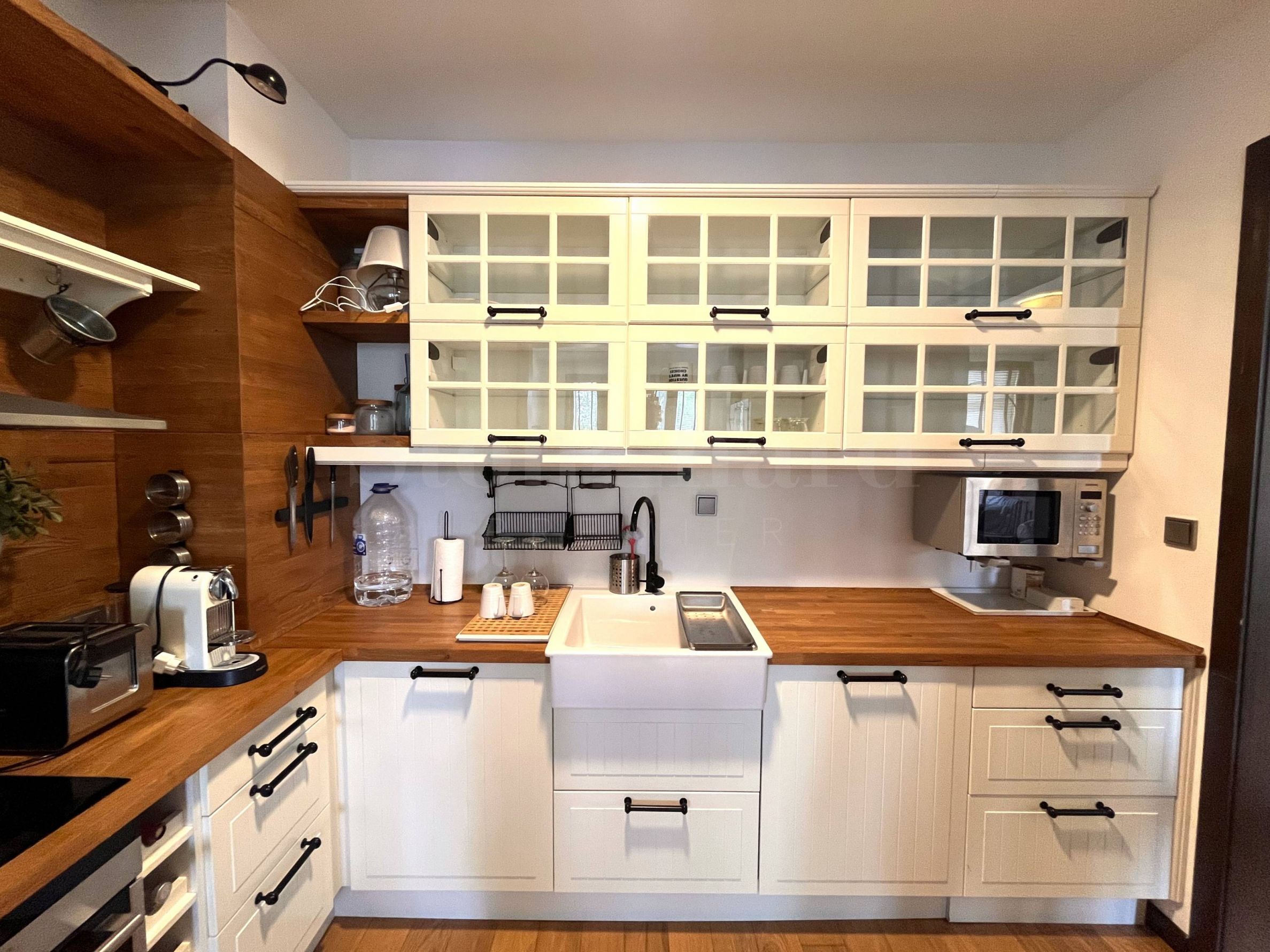 two terraces. The apartment is fully furnished and equipped with modern and comfortable furniture, high-end appliances and attention to every detail. The joinery is made of eucalyptus wood and offers excellent sound insulation, and the floor has three-layer natural parquet.