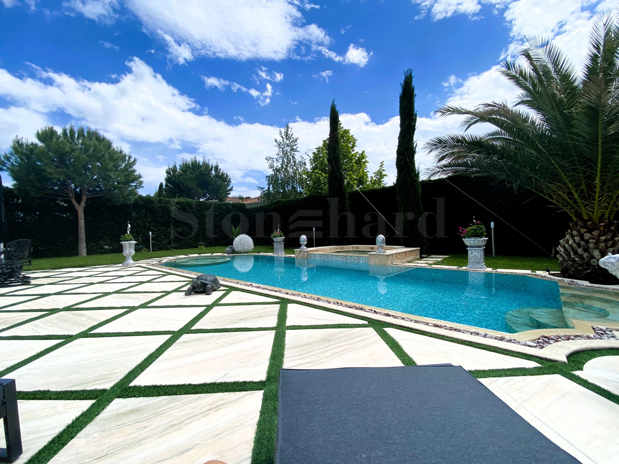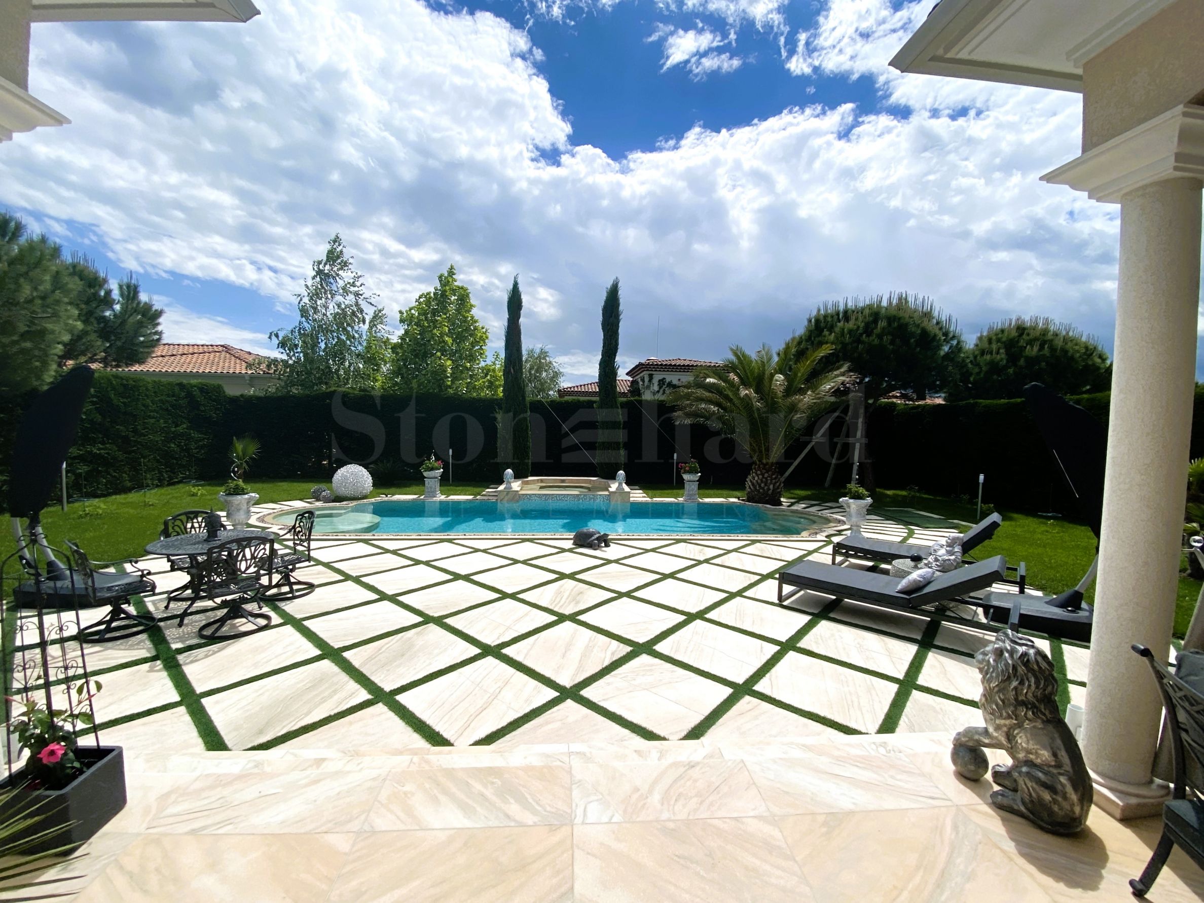 In the richly landscaped garden with exotic trees and flowers, there is a centrally located swimming pool with jacuzzis, completely lined with natural stone "Rosso portogalo". It also has a covered parking space next to the entrance.