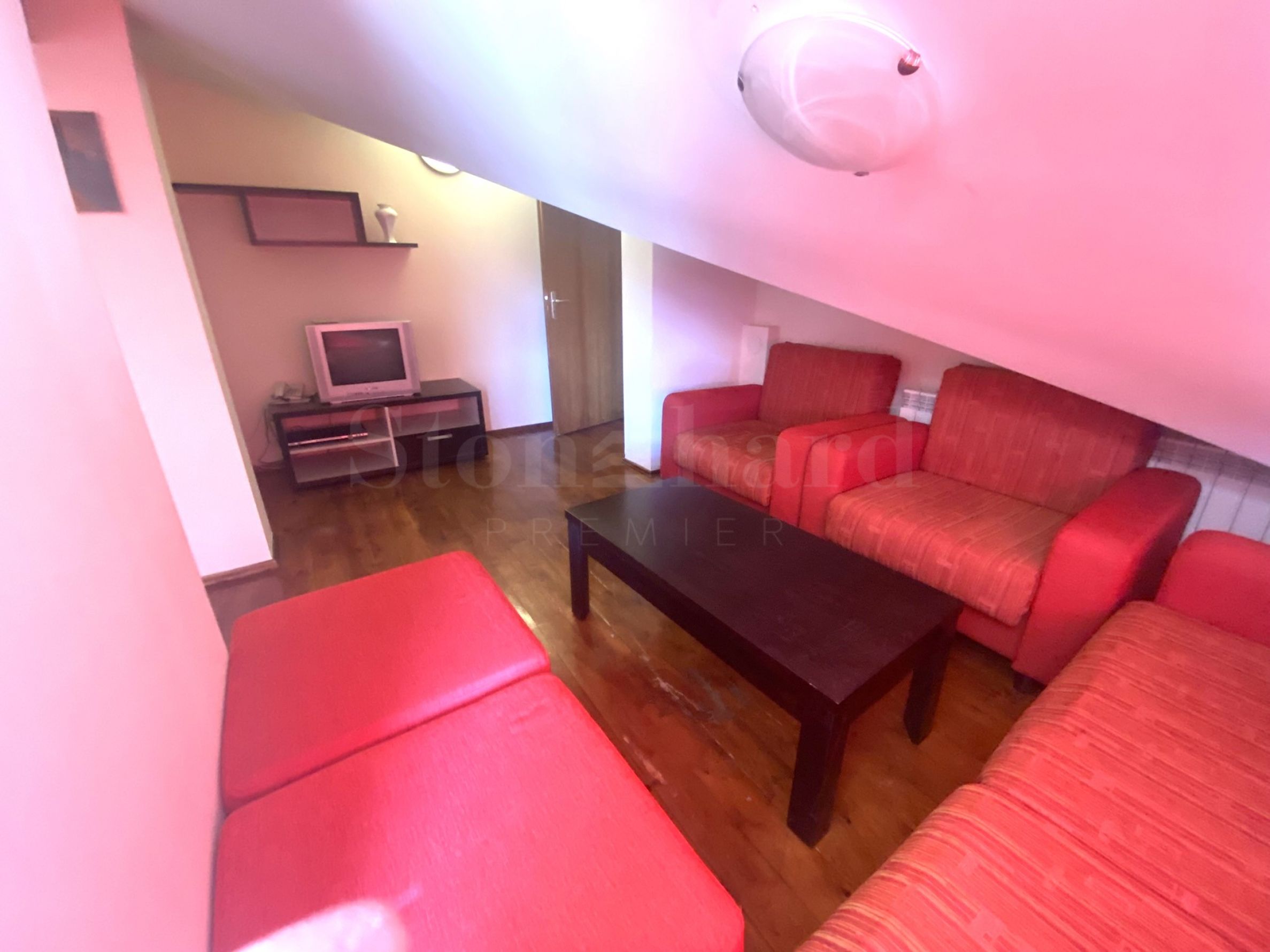 living room with sofas, TV and balcony with incredible views of Rila and Pirin Mountains;