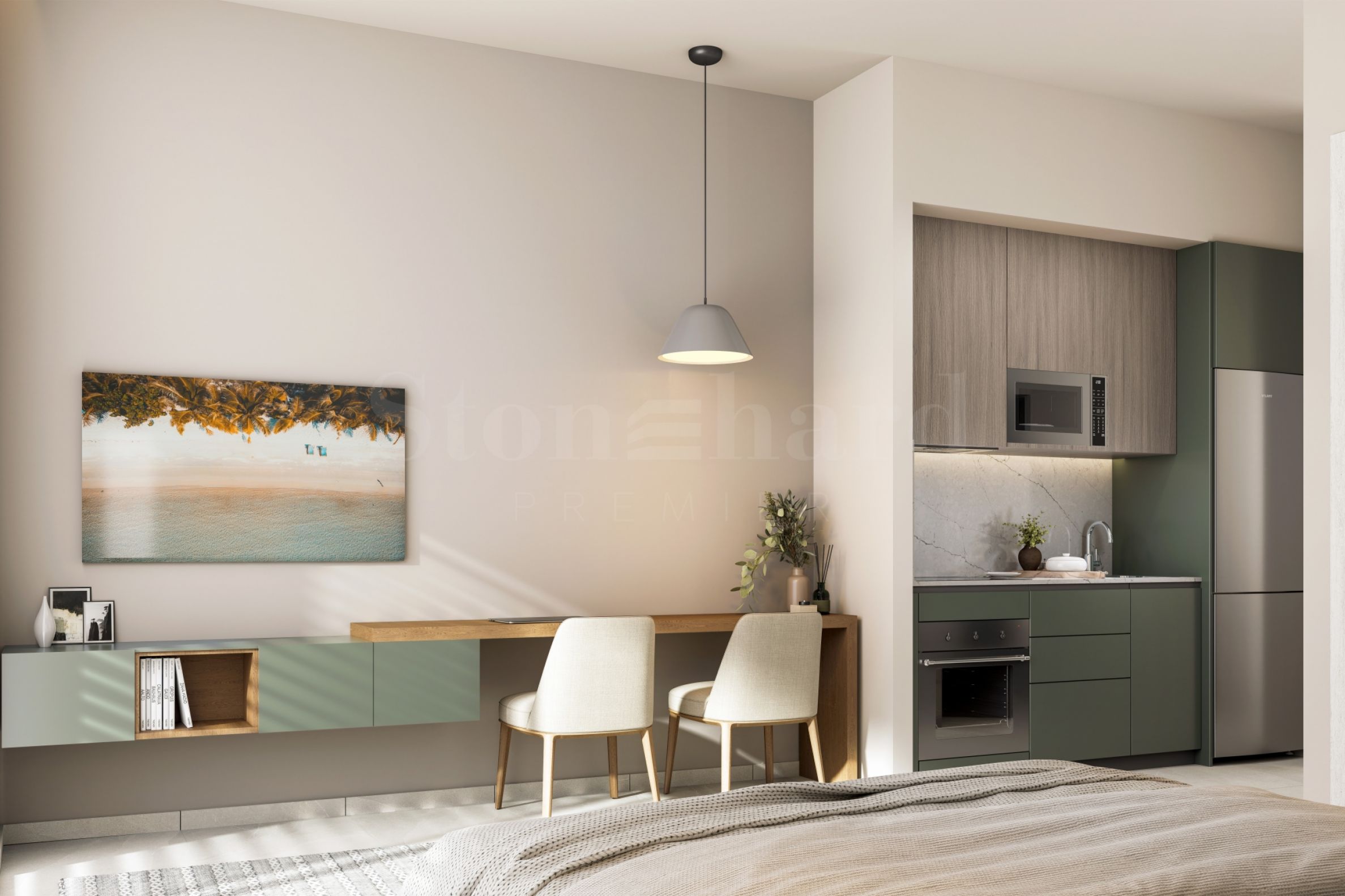 The apartments in the project are offered fully furnished, with the latest European finishes and furniture. LEED-certified natural Italian porcelain adorns the kitchen, living room and bedrooms in each unit. The kitchens have a modern design and first-class kitchen appliances, ensuring that every culinary endeavor is a pleasure. Italian modular cabinets and integrated handles complement the minimalist aesthetic while providing ease of use. Available in quartz or ceramic, the worktops are not only visually stunning but also highly durable, making them ideal for the demands of a busy kitchen. High-quality European kitchen faucets add an element of elegance and durability, while stainless steel sinks offer superior durability.