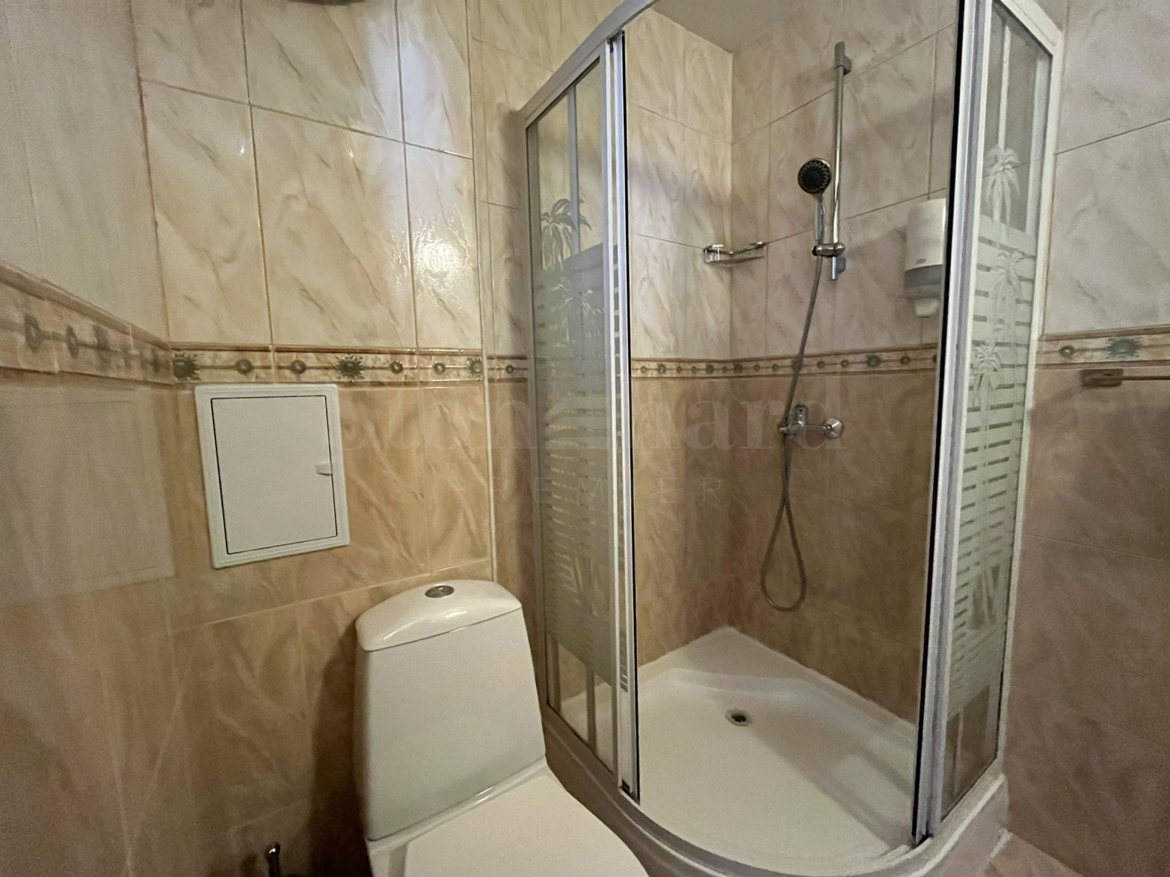 Bathroom with shower cabin and toilet;