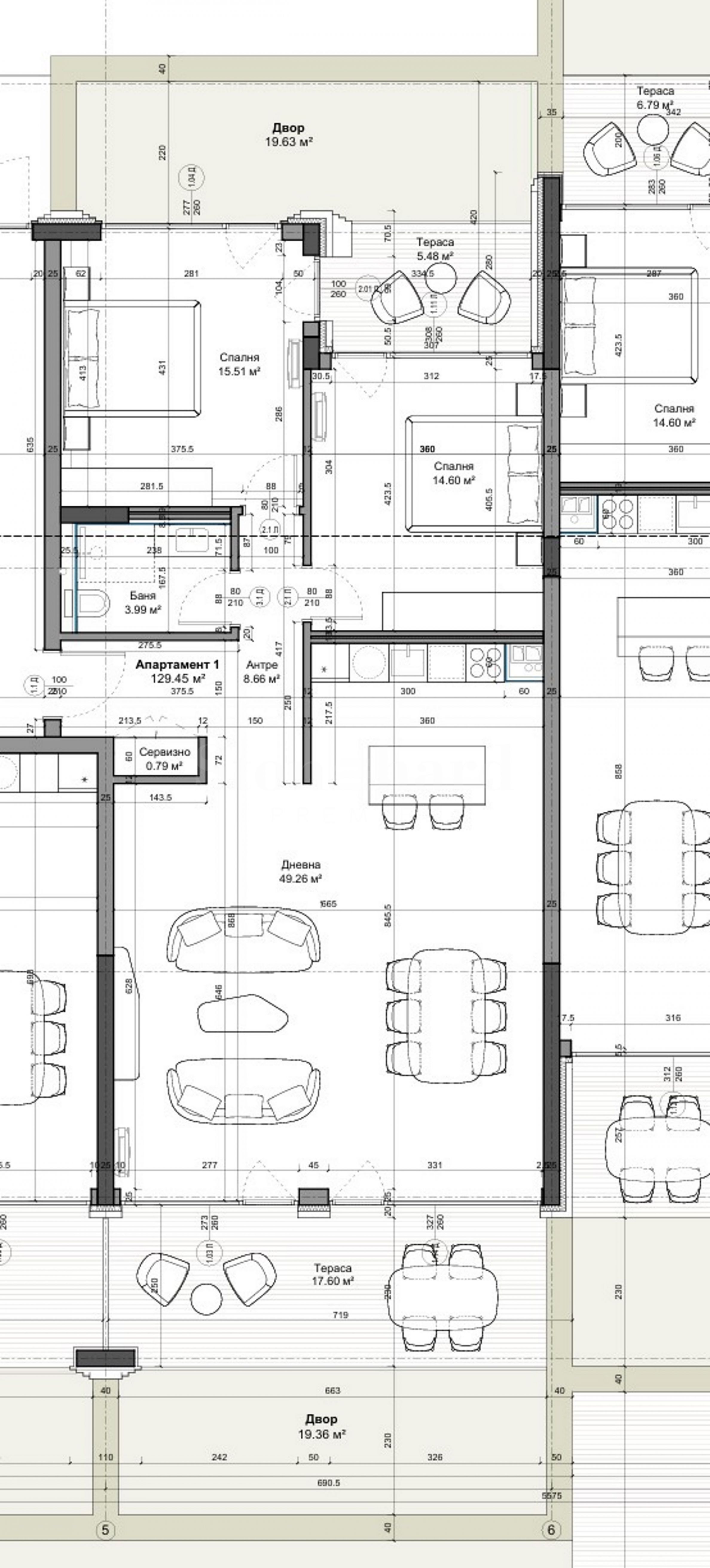 On the third line from the beach there will be 4 buildings of 3 floors + terraced, with spacious three- and four-room apartments, just 100 meters as the crow flies from the sea. The apartments here are offered on a plastered and screeded basis, with the option of furniture.