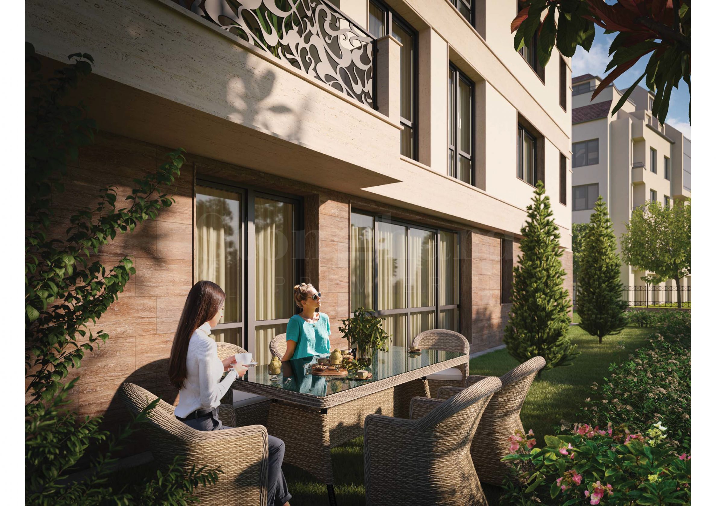 The building is small and boutique, consisting of four floors, designed with attention to detail and filled with high-quality materials that meet modern standards for comfort and energy efficiency. The facade is stylishly designed with elegant stone cladding elements and decorative metal railings, giving a modern and at the same time classic look.