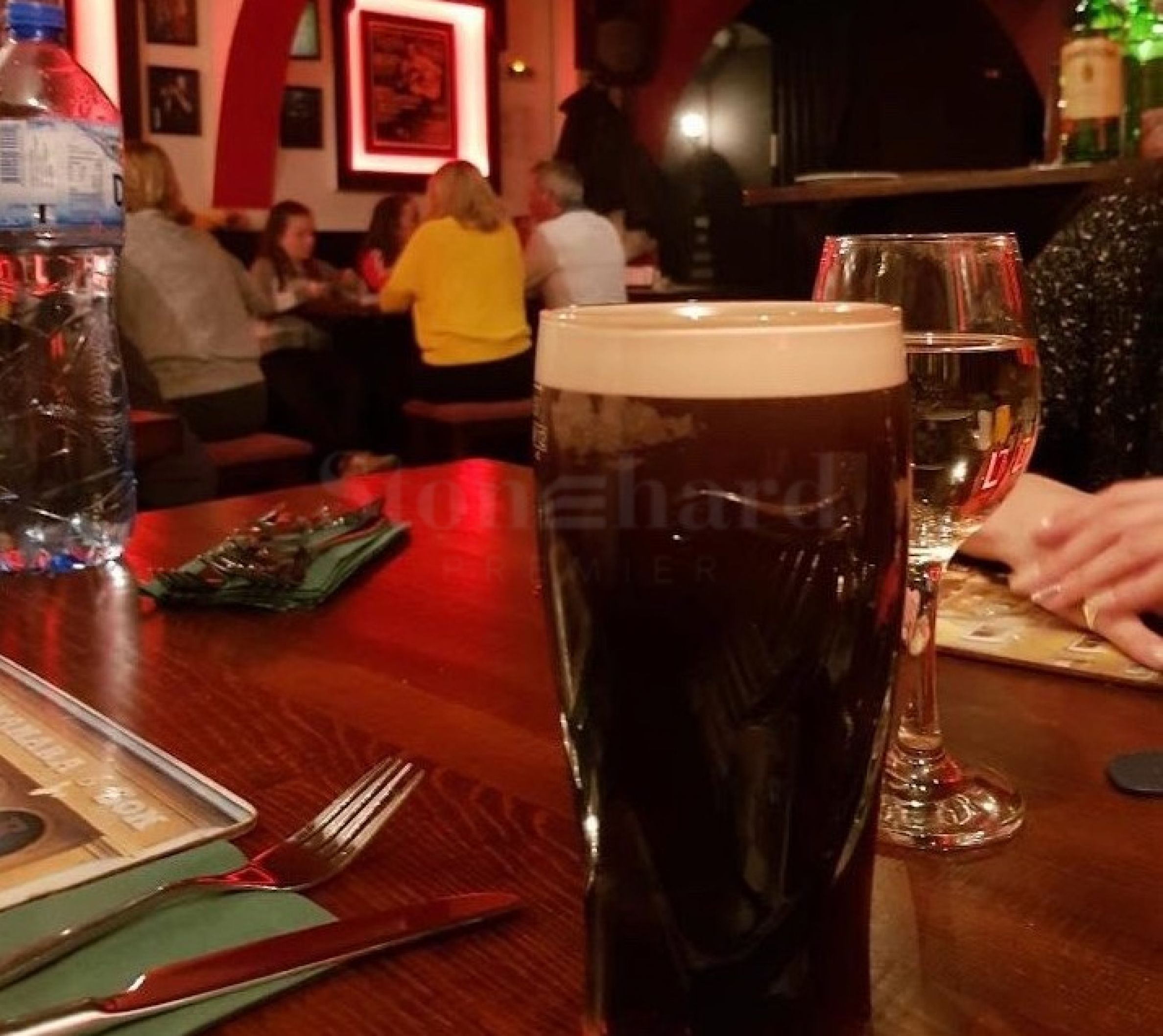 Irish interior, traditional Irish cuisine, variety of cocktails and drinks.