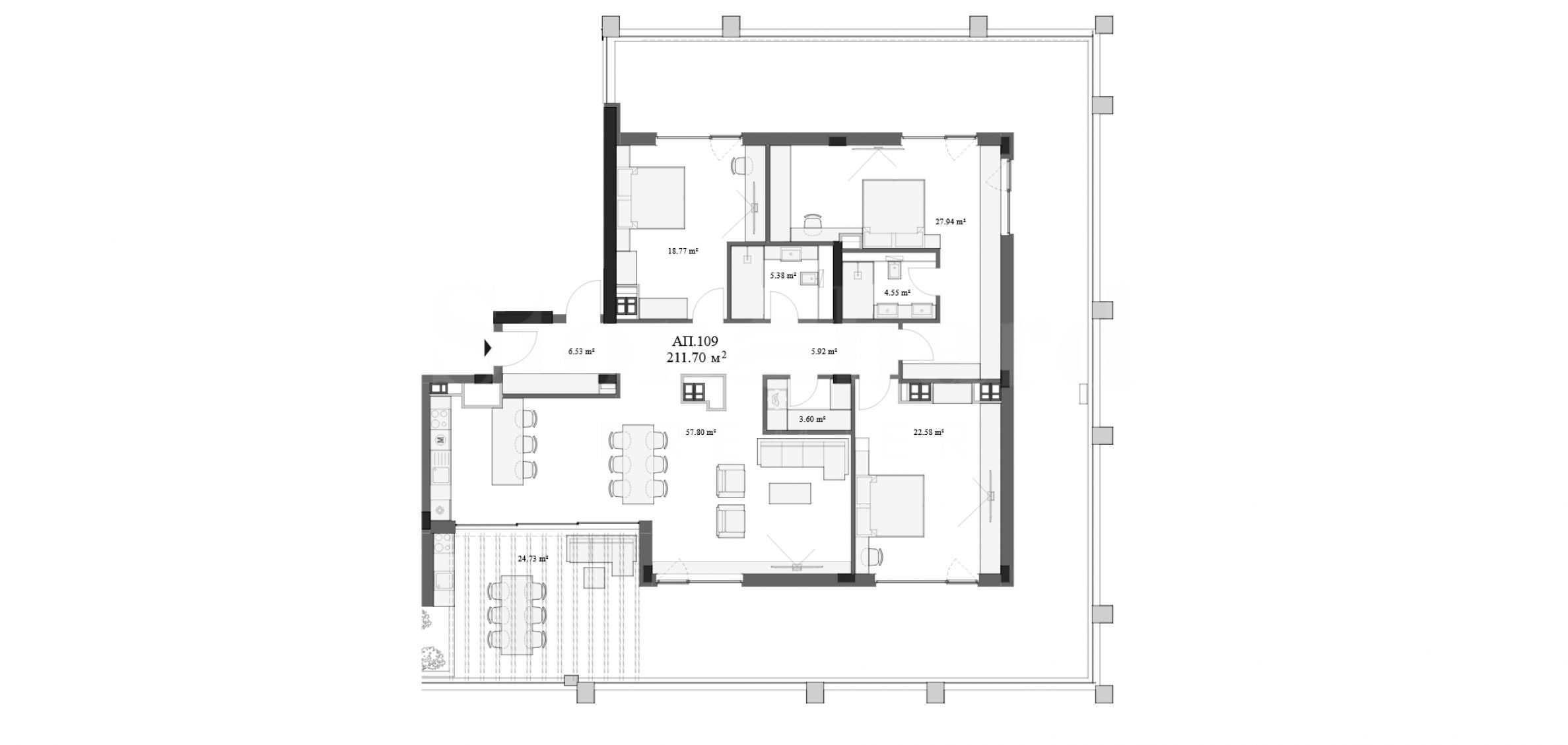 The apartment has a total area of 253.56 sq m, is located on the top floor of a 16-story building and has the following layout: