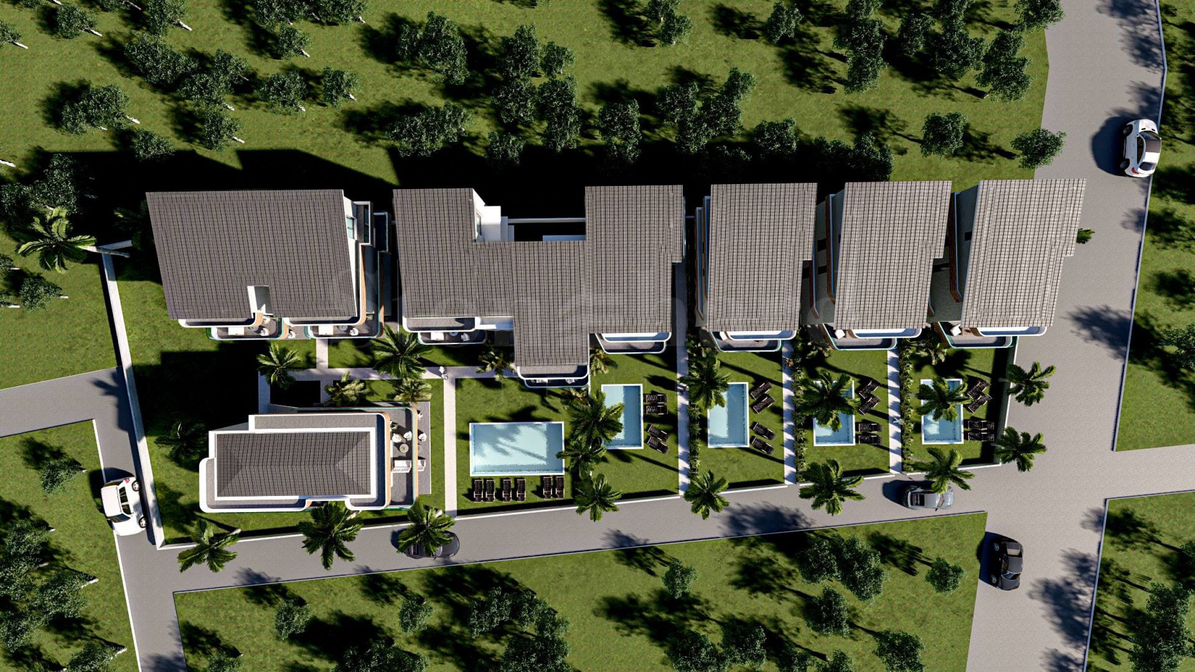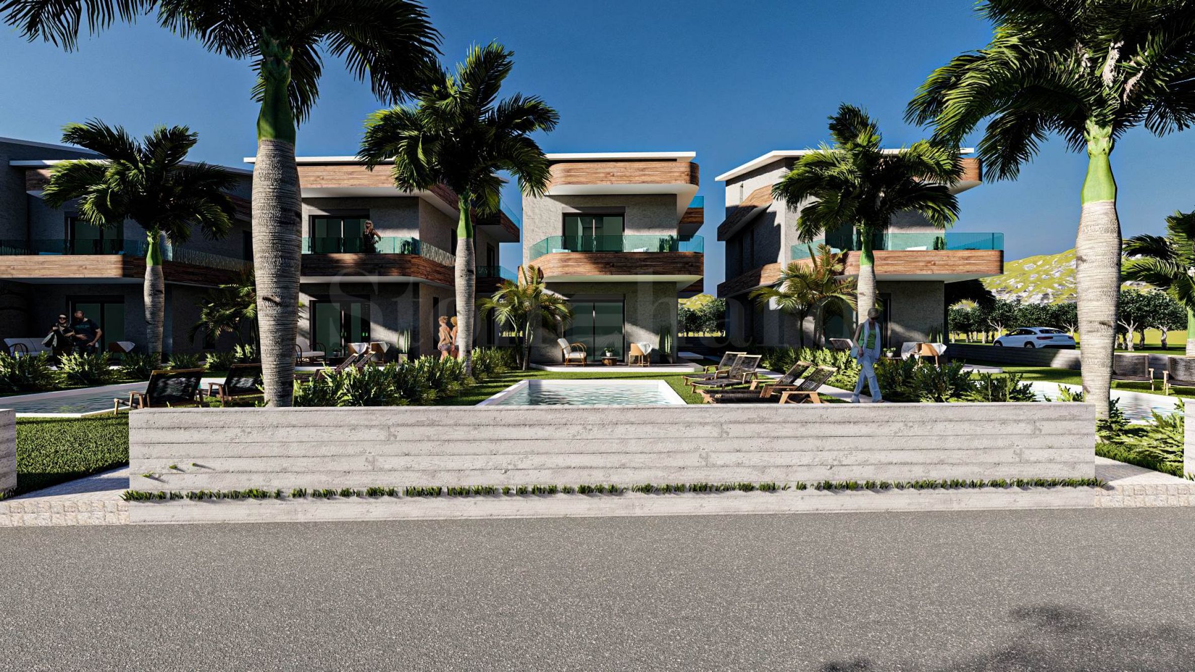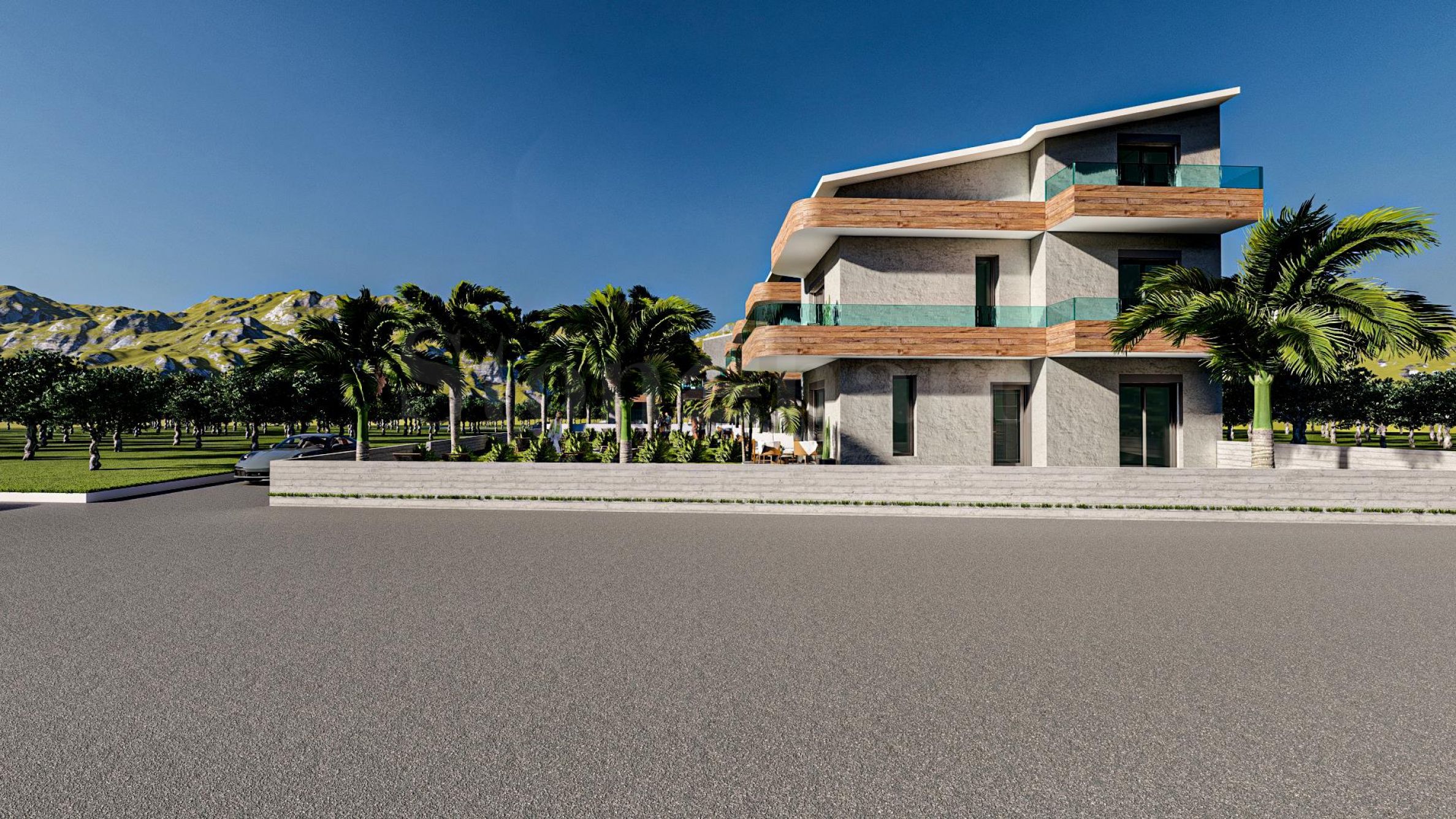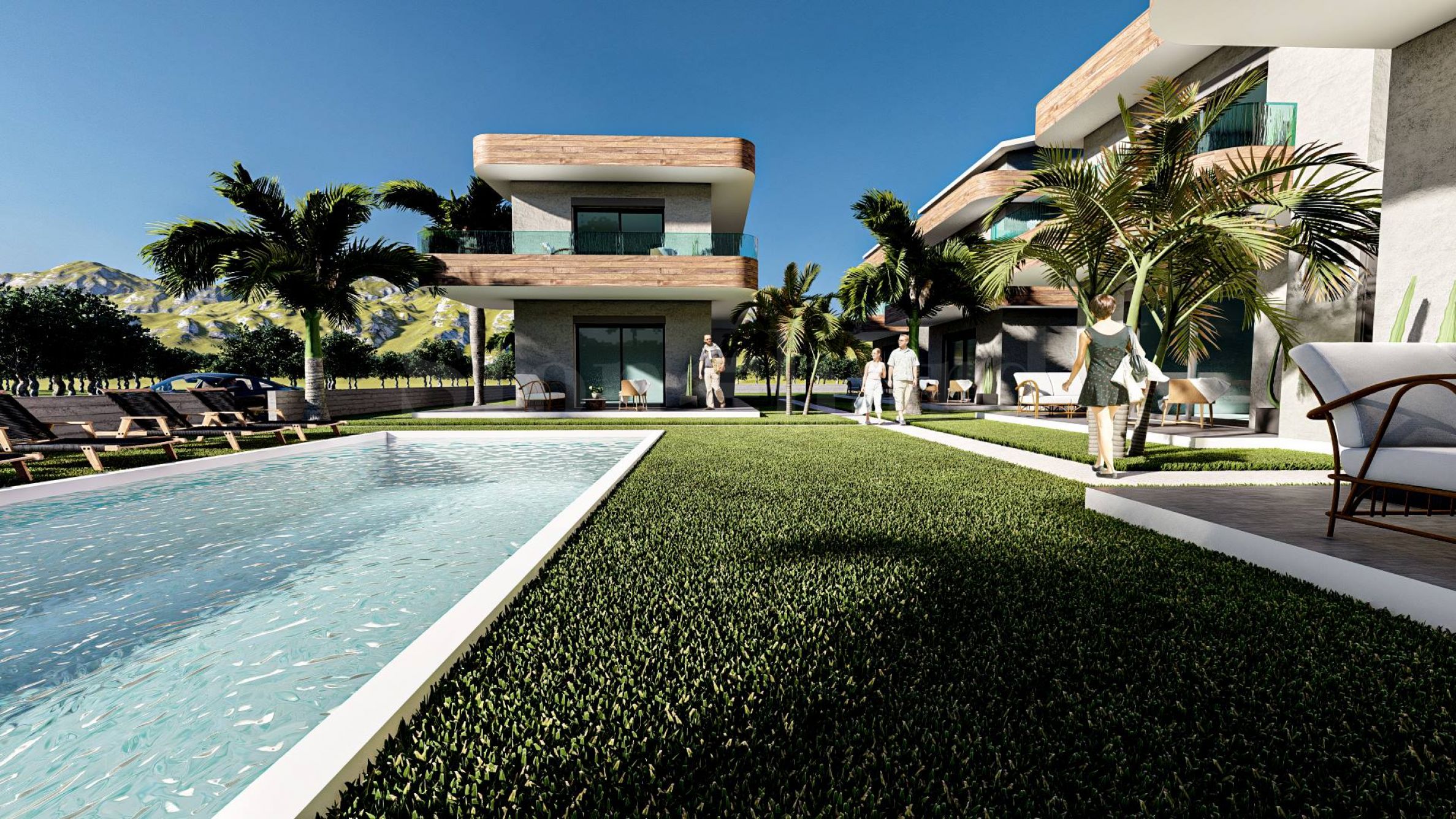5 common outdoor swimming pools, which are available to all residents of the complex. All apartments are offered complete "turnkey", with interior doors, flooring, kitchen cabinets and a fitted bathroom.