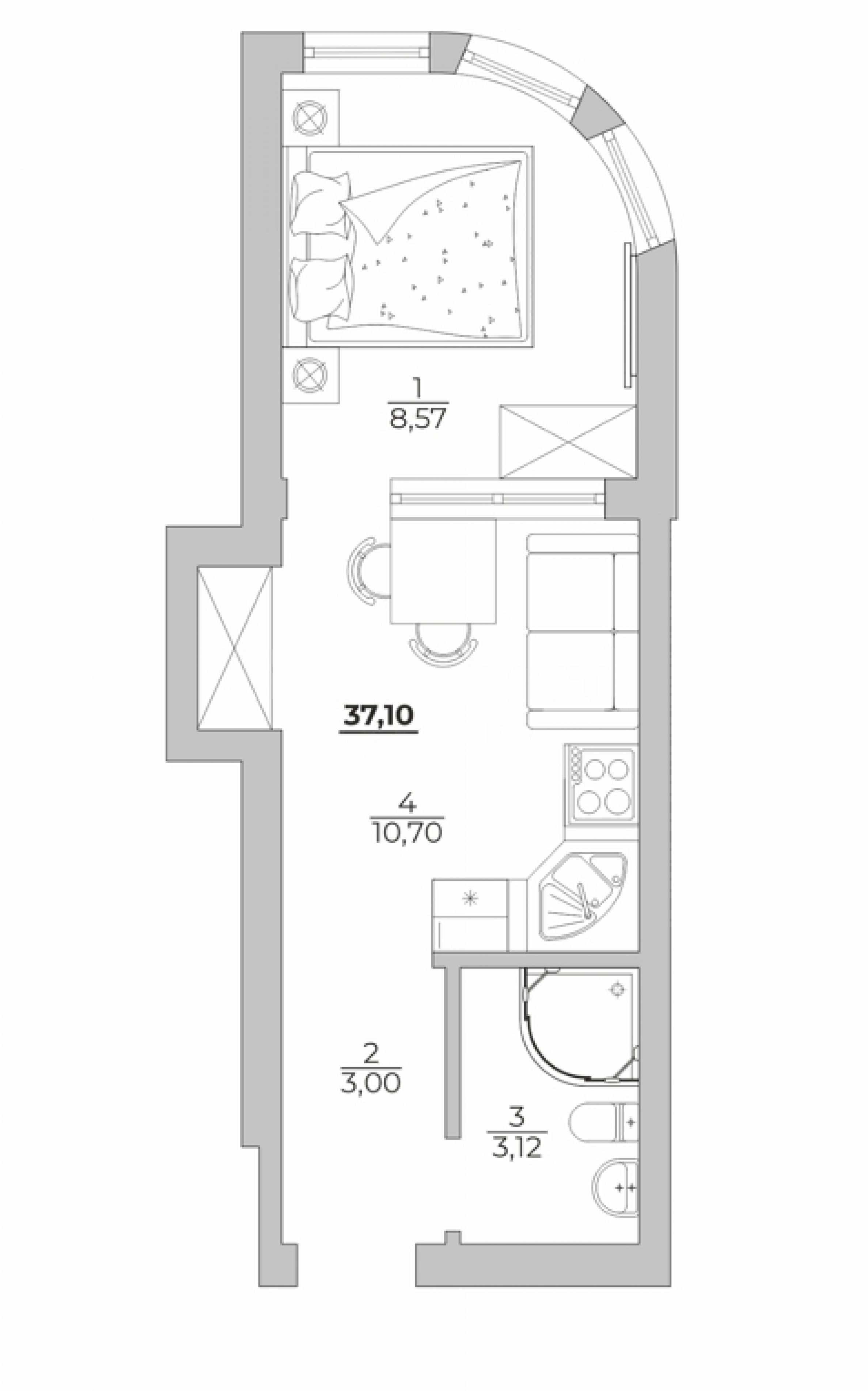 The apartment with a total area of 37.10 sq.m is located on the 2nd floor of 5, with a view of the oak forest and has the following layout:
