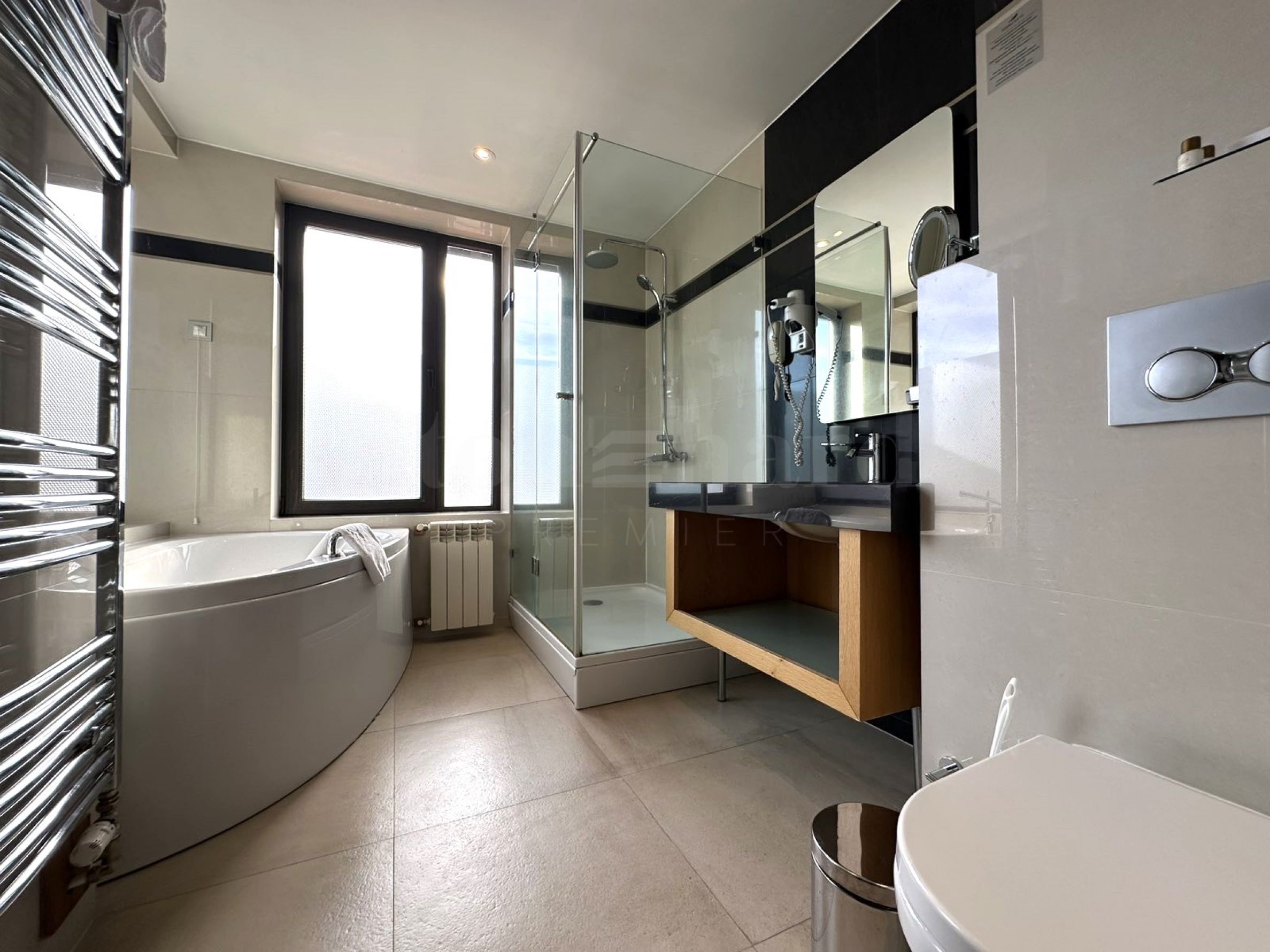 Bathroom with shower cabin, bathtub and toilet;