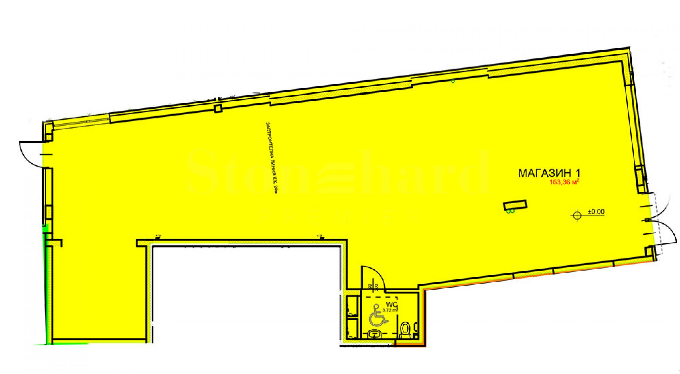 Shop No. 1 is located on the 1st floor and has a total area of 194.40 sq m, includes a bathroom. It is offered in a degree of completion according to Bulgarian Standards.