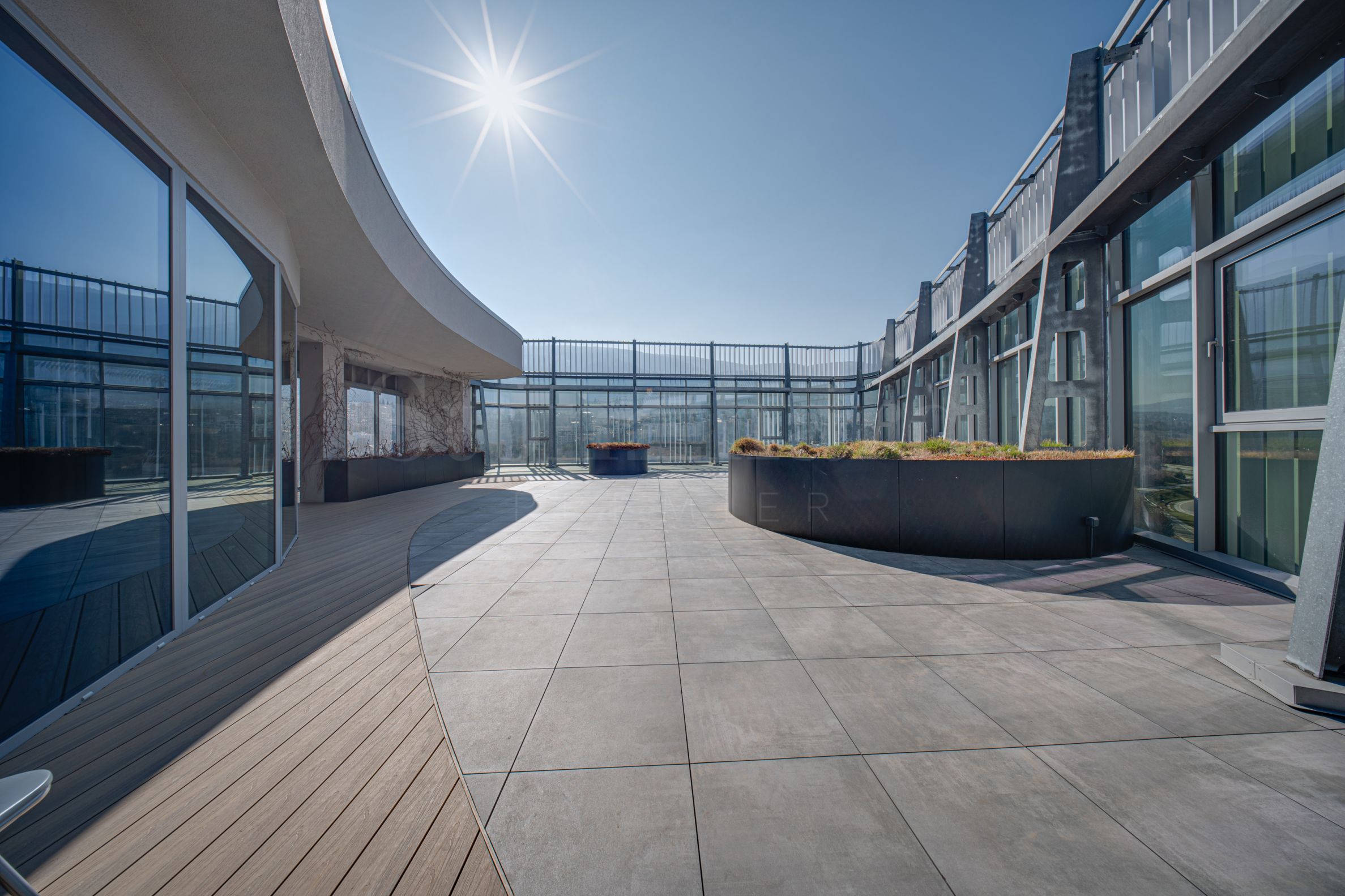 The building is developed in 11 levels above the terrain, vertically divided into 3 groups - main level with entrance, reception area - representative lobby and shop, floor with showroom, 7 floors with spacious and bright offices and 2 floors with multifunctional areas - event hall and roof garden, revealing impressive views of the city and the mountain. It has two underground levels for parking and service premises. The parking for visitors and employees in the building has controlled access and 24-hour security.