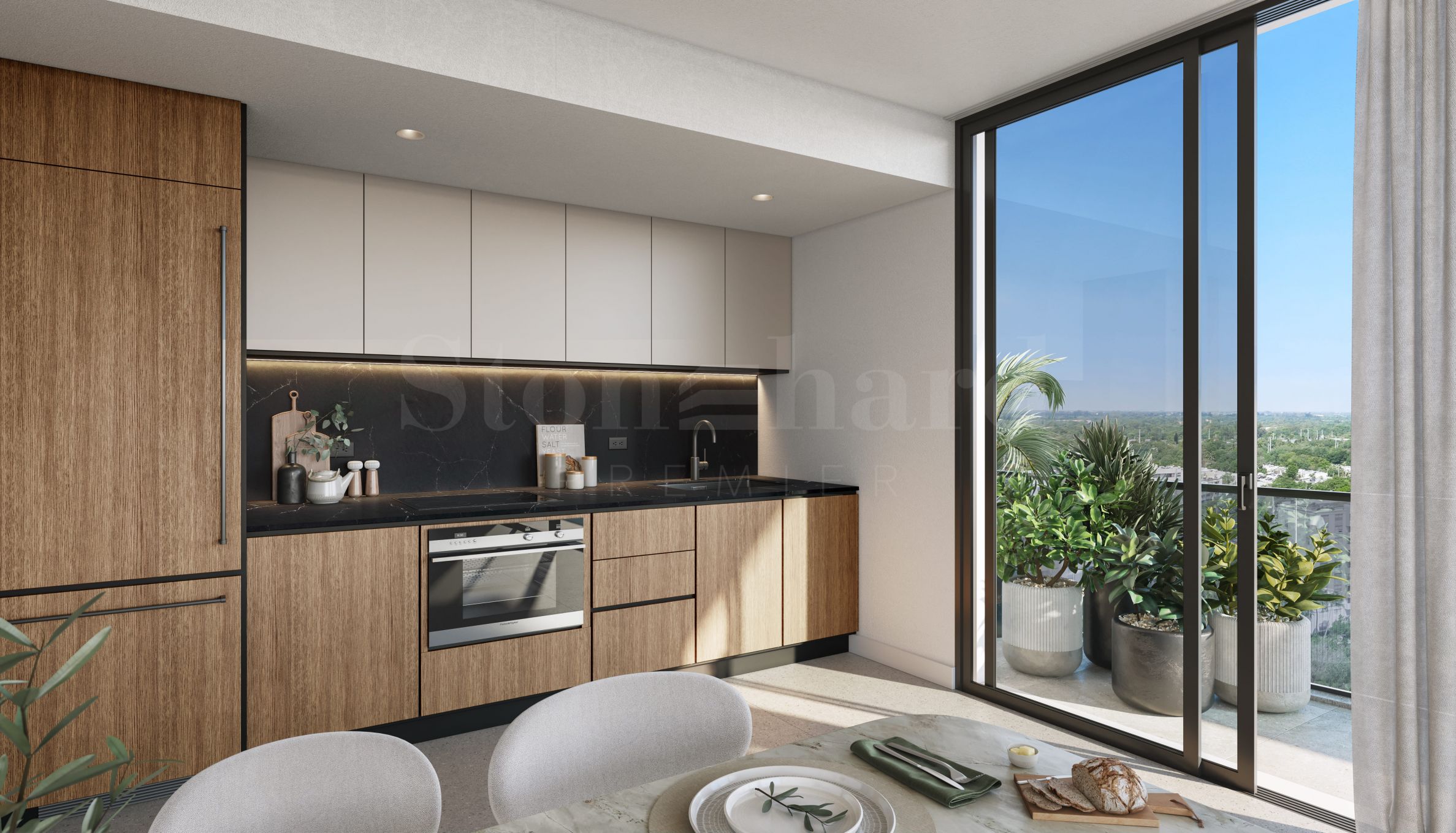 The apartment facilities an elegant terrace, which not only adds to the feeling of spaciousness, but also emphasizes the distinctive architecture of the building. The kitchen is equipped with premium appliances, high-quality European cabinets and a natural quartz countertop, bringing a sense of style and reliability.