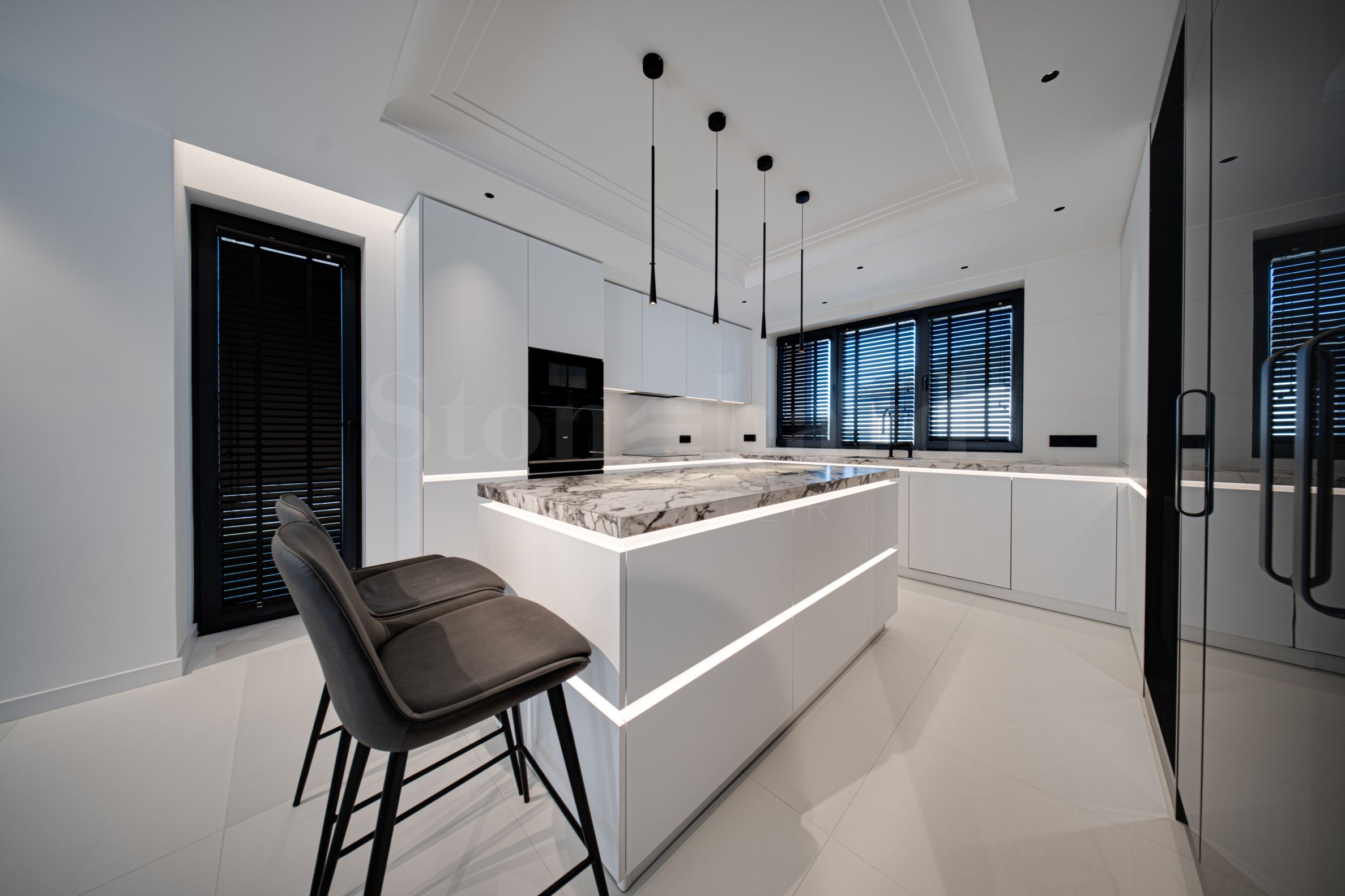 Basement - garage for four cars (and two outdoor parking spaces), service and storage rooms. All finishing materials and equipment are high-class: