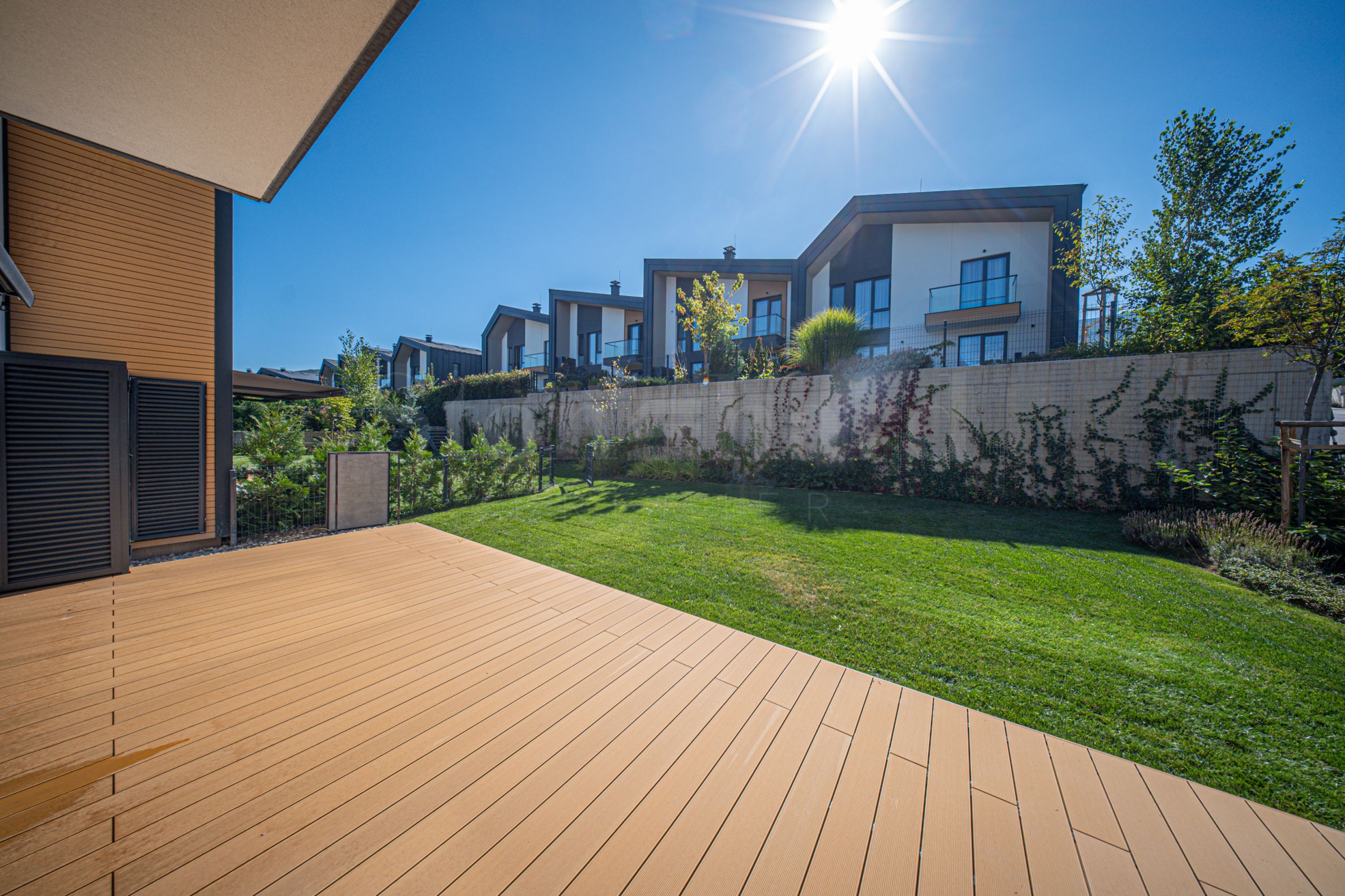 veranda with decking, etc. For convenience , solutions are provided that ensure a pleasant everyday life - a decorative fireplace with water vapor, outdoor furniture for the veranda, an awning with automatic control and wind sensors, and a charging station for electric vehicles.
