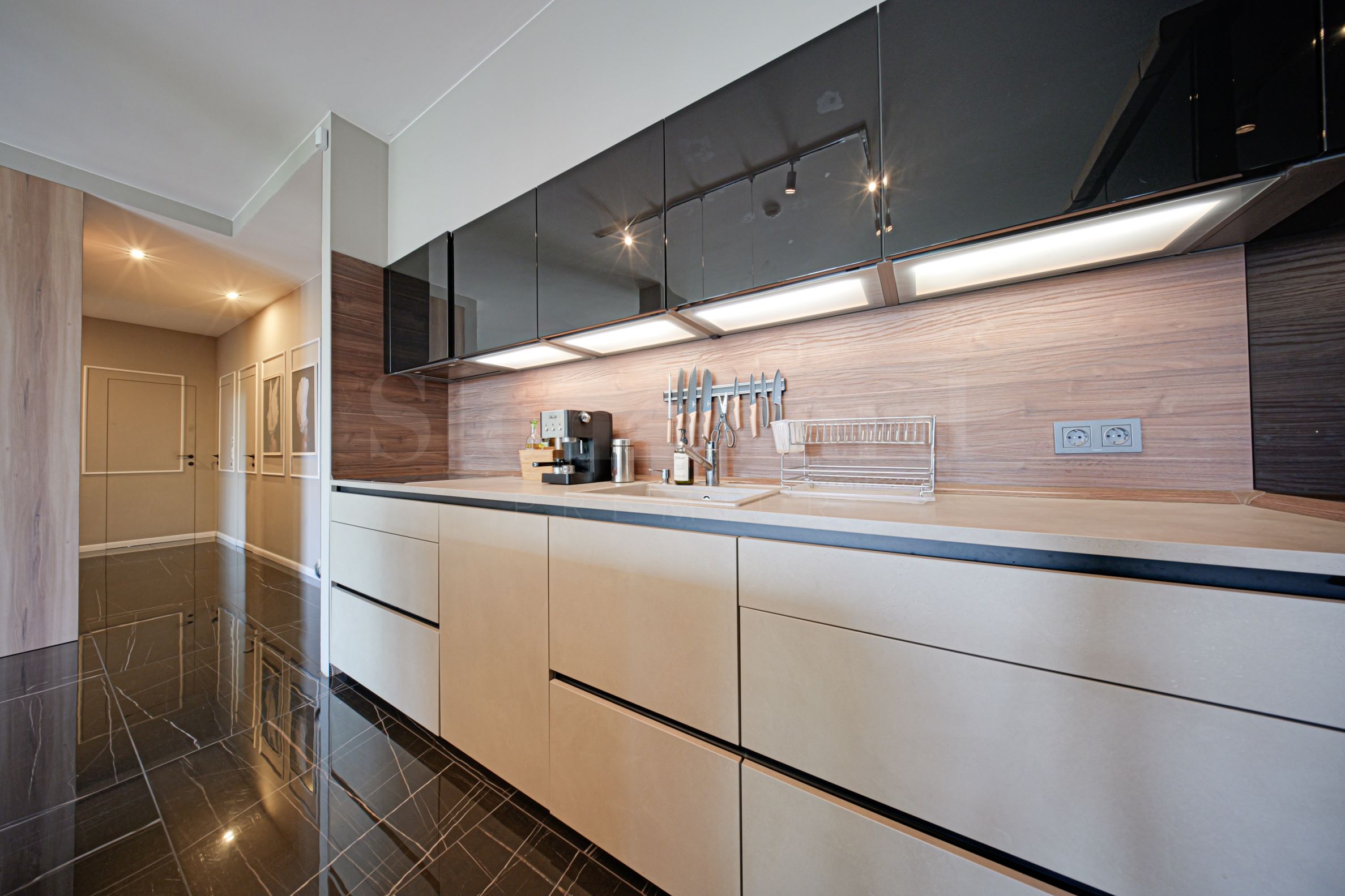 The kitchen is built-in, custom-made, equipped with high-end Bosch and Neff appliances, which guarantee functionality and style.