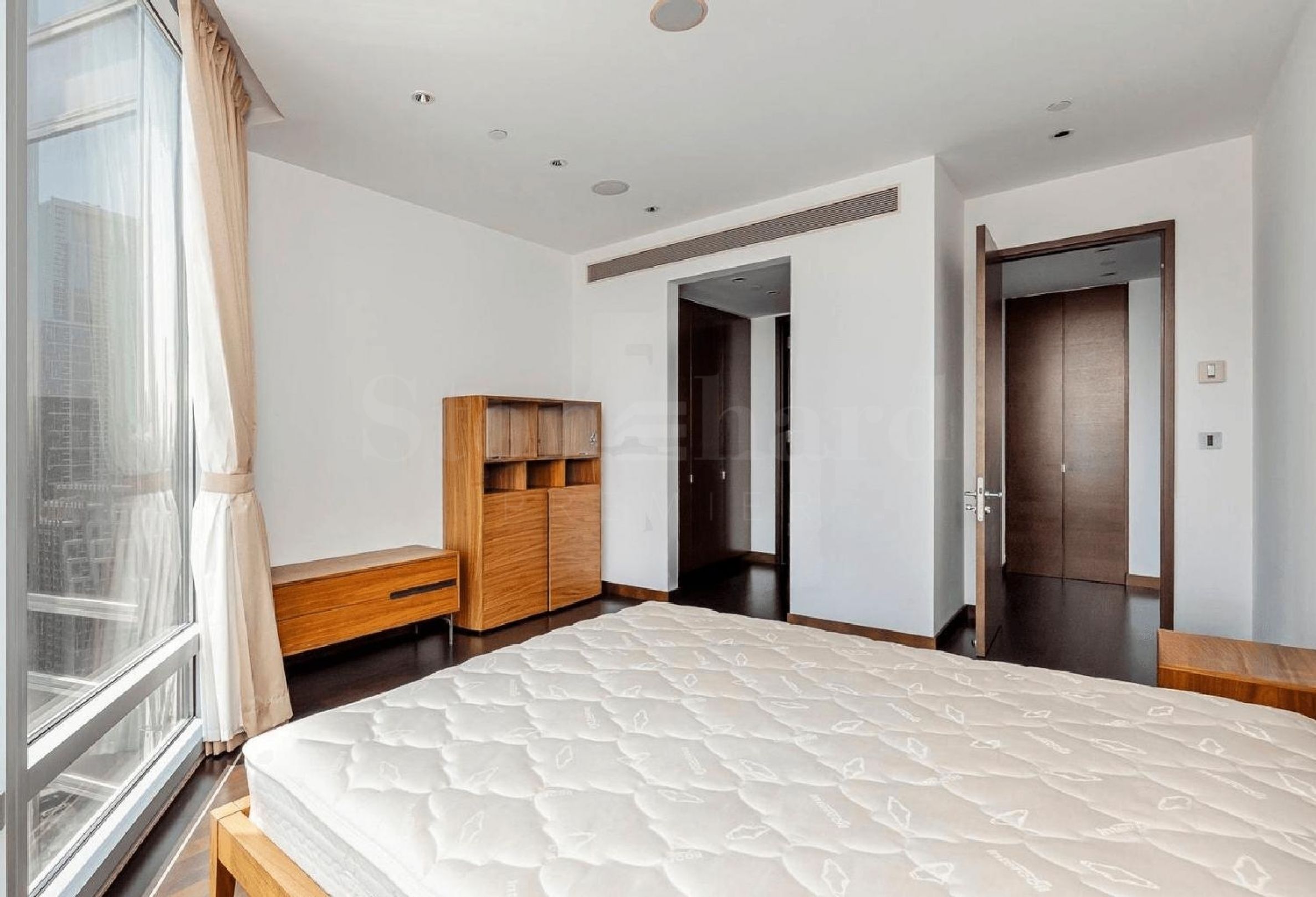 The apartment is lightly furnished with modern, tasteful pieces that offer both comfort and style. The open-plan living and dining area, adorned with floor-to-ceiling windows, fills the space with natural light and showcases breathtaking cityscapes.